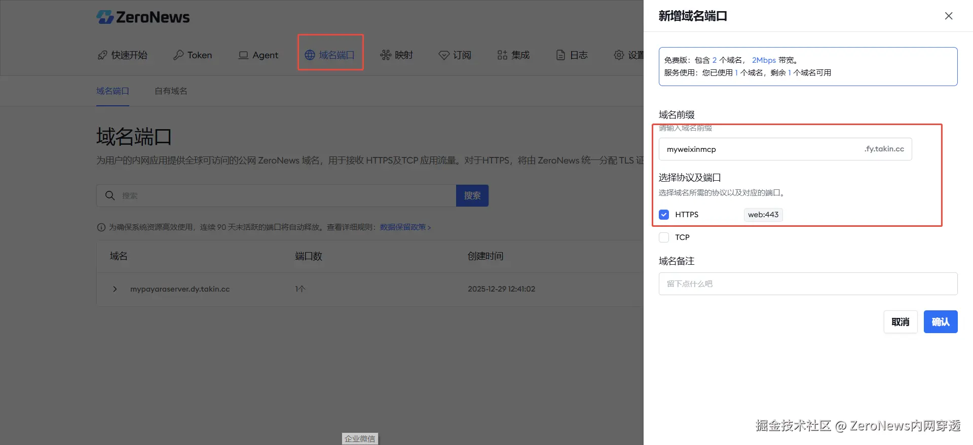 3. 接着,我们在域名端口页面,创建一个可用的公网域名(自定义前缀),并勾选HTTPS 协议端口。