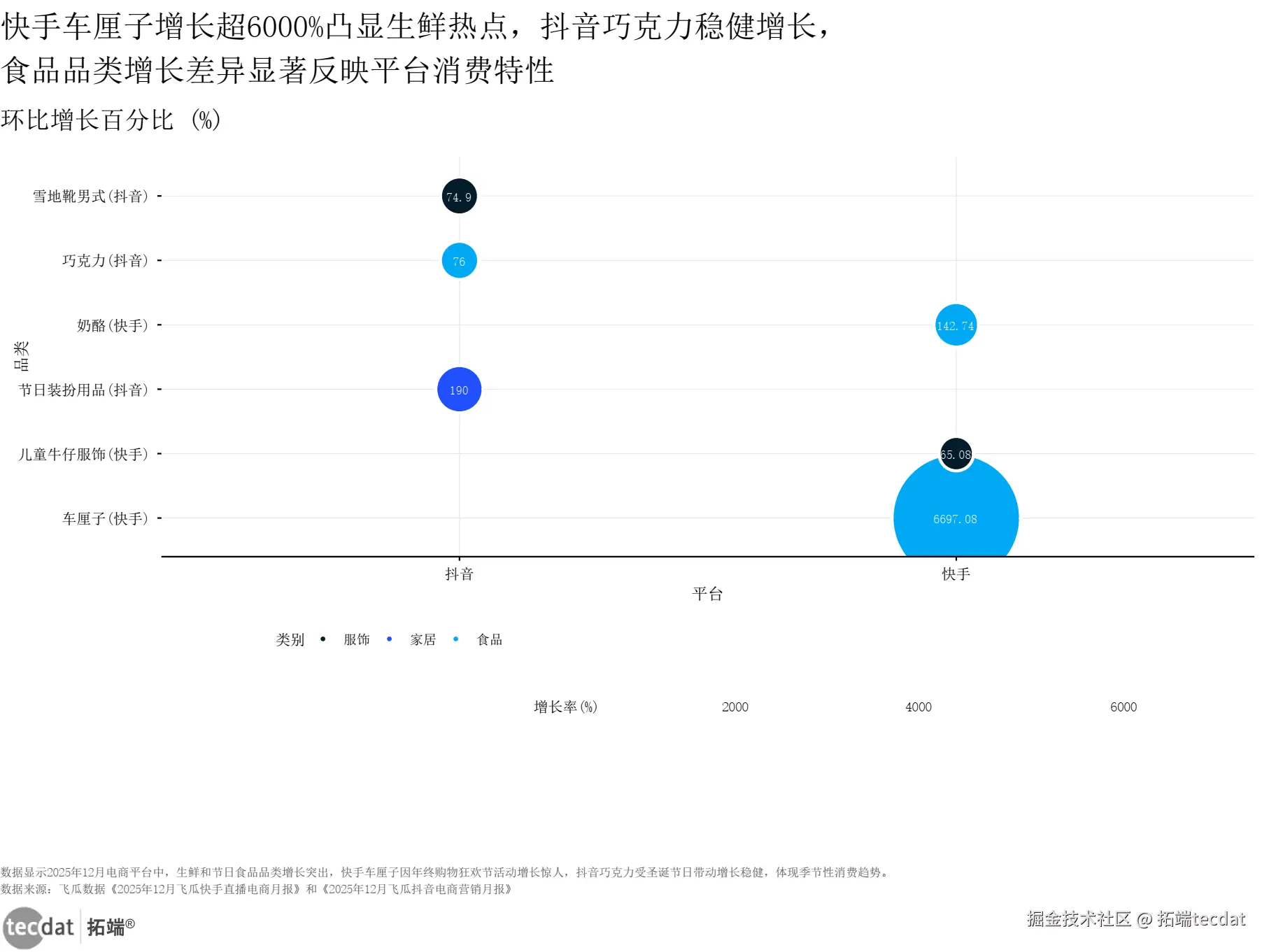 直播电商仍是电商行业核心增长引擎,但快手、抖音两大平台呈现鲜明的品类特色与增长逻辑差异。快手平台中,车厘子品类环比增长6697.08%成为年末最大黑马,奶酪(142.74%)、儿童牛仔服饰(65.08%)同样表现亮眼;抖音平台则以巧克力(76%)、节日装扮用品(190%)、男式雪地靴(74.9%)增长突出(图表10)。3秒解读:快手擅长生鲜、母婴等生活化品类,抖音在节日用品、服饰等场景化品类中更具优势。行动建议:生鲜商家优先布局快手,节日礼品品牌重点发力抖音;跨平台运营商家可根据品类特性分配资源,实现精准适配。