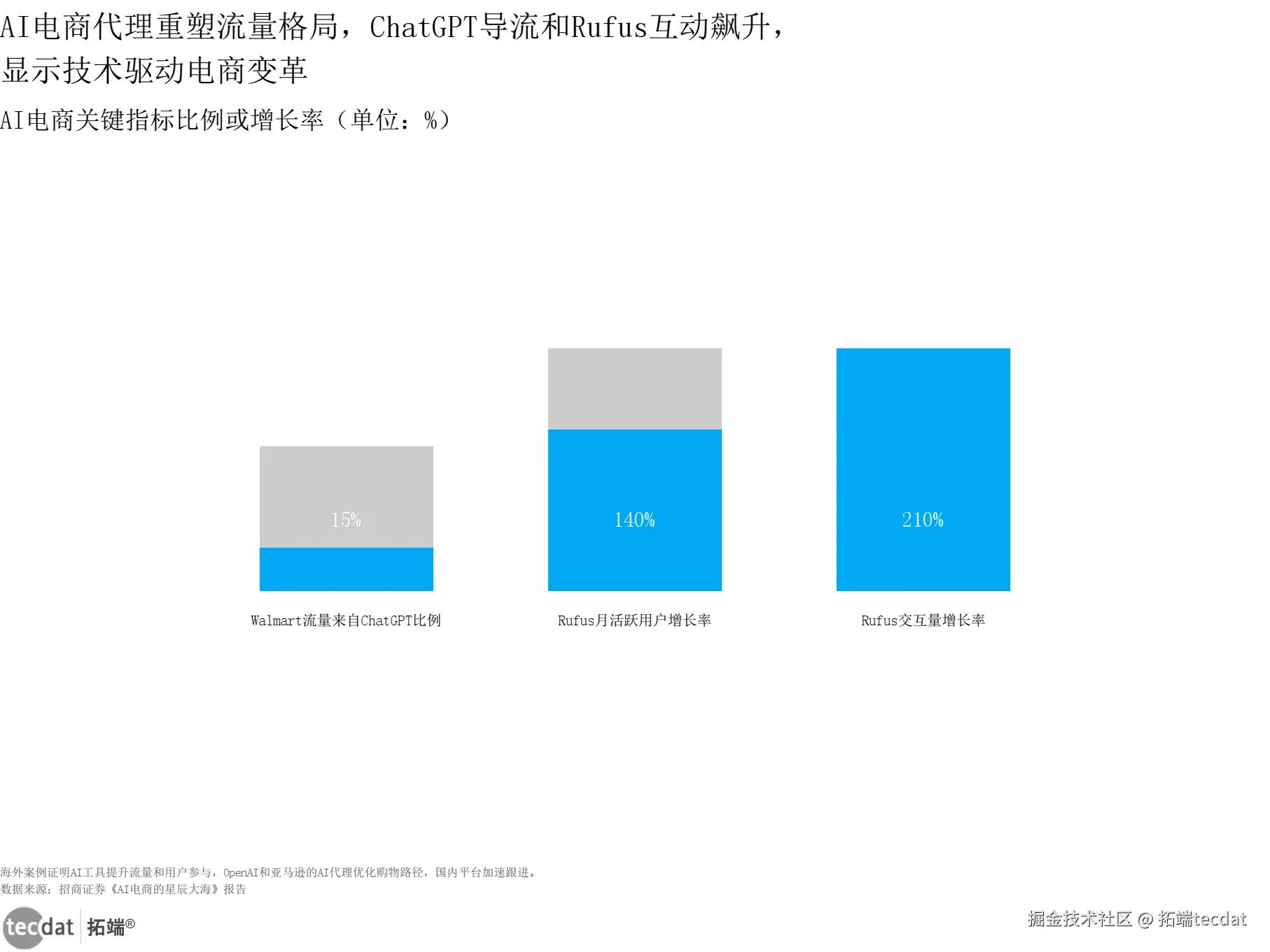 AI技术的爆发式发展正在颠覆电商行业的底层逻辑,从“人找货”到“AI荐货”,从平台导流到智能代理,新的商业生态已初步成型。海外市场的实践验证了其巨大潜力:Walmart 9月总推荐流量中15%来自ChatGPT,亚马逊Rufus模型月活跃用户数同比增长140%,交互量同比增幅达210%(图表8)。3秒解读:AI已成为核心流量入口,用户对智能推荐的接受度显著提升。行动建议:跨境电商需尽快接入AI代理工具,优化商品信息适配AI搜索逻辑;国内品牌可布局抖音豆包、阿里千问等头部AI助手的场景化推荐链路。
