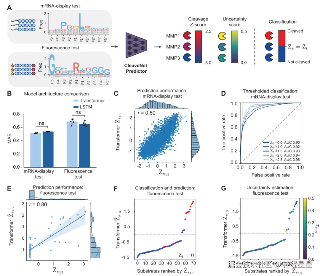 尽管该数据集的序列长度、氨基酸组成及检测原理均与训练数据不同,模型预测的切割分数与实验值之间依然维持强正相关(针对MMP13,r = 0.80),并能准确地将实验验证的「切割」与「未切割」序列区分开来。这有力地证实了 CleaveNet Predictor 不仅能够记忆训练数据模式,更能捕捉底物被蛋白酶切割的普适性生化规律,具备强大的泛化能力。