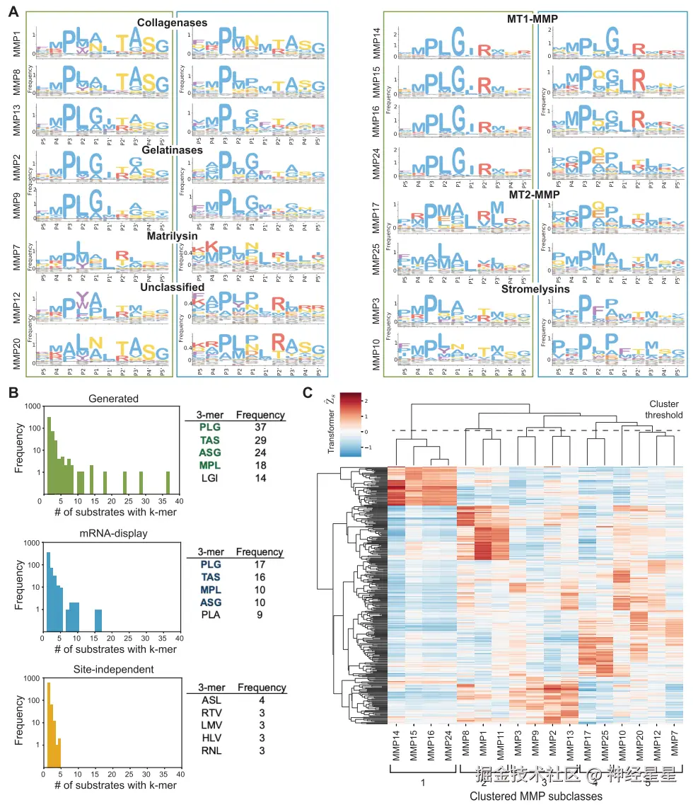 生成序列重现了不同 MMP 功能类别中具有生物学意义的切割模式