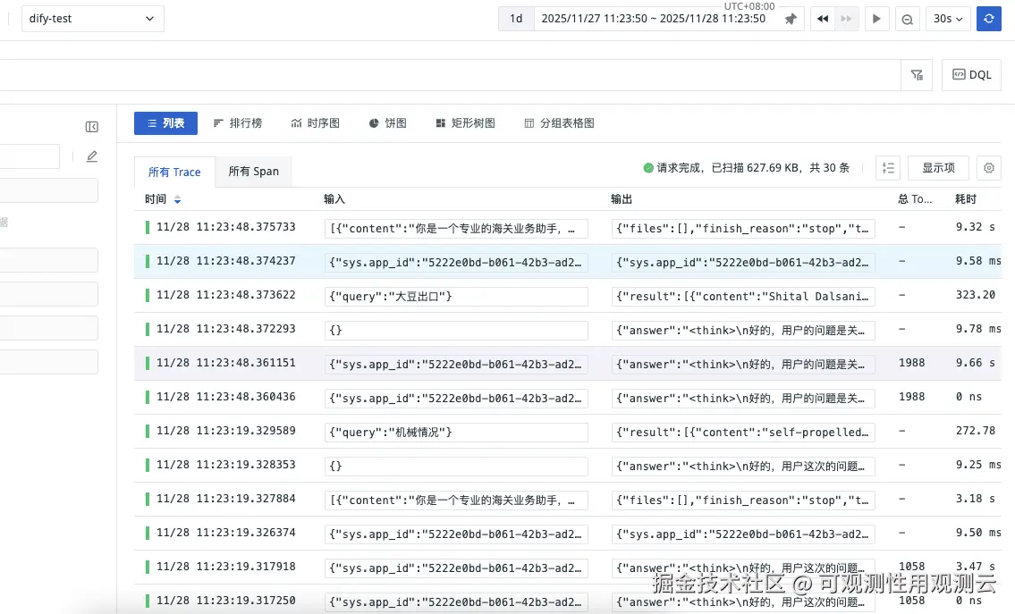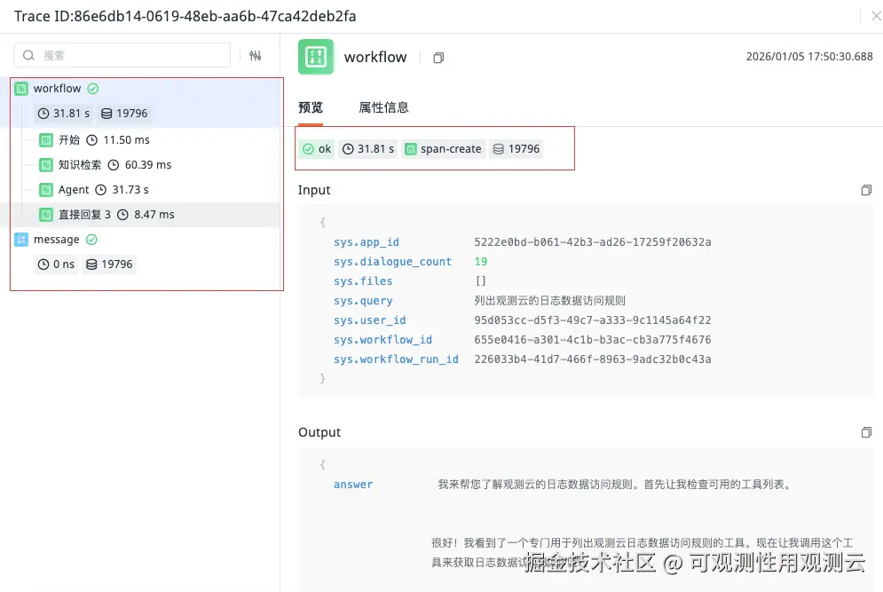 - 查看单次请求的完整链路:清晰查看用户提问从接收、处理(如数据库查询)、到调用 LLM 模型并返回答案的整个过程