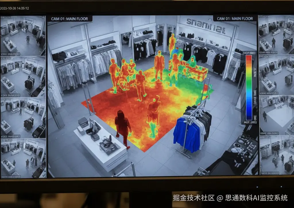 你的监控不仅能防盗,还能帮你“画”出利润区:想象一下,无需询问,无需跟拍,你的店铺就能自动生成一张“顾客注意力地图”。图中红色的每一处深浅,都是顾客用脚投票的结果。哪里是人群聚集的“热土”,哪里是被忽略的“死角”,一目了然。在思通数科 AI 视频卫士的眼里,看不见的流量,变成了看得见的决策。