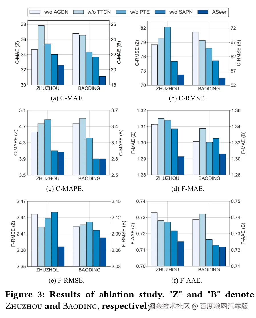 ASeer 在两个数据集的 6 项指标中均取得最优成绩(如表 1 所示)。例如,在株洲数据集上,C-MAE 达到 32.58,较最优基线模型 PDFormer(36.48)降低 10.7%;在保定数据集上,C-MAE 为 19.12,较最优基线模型 GWNet(26.50)降低 27.8%。这验证了 ASeer 在异步空间依赖、不规则时间依赖建模和变长序列预测上的优越性。