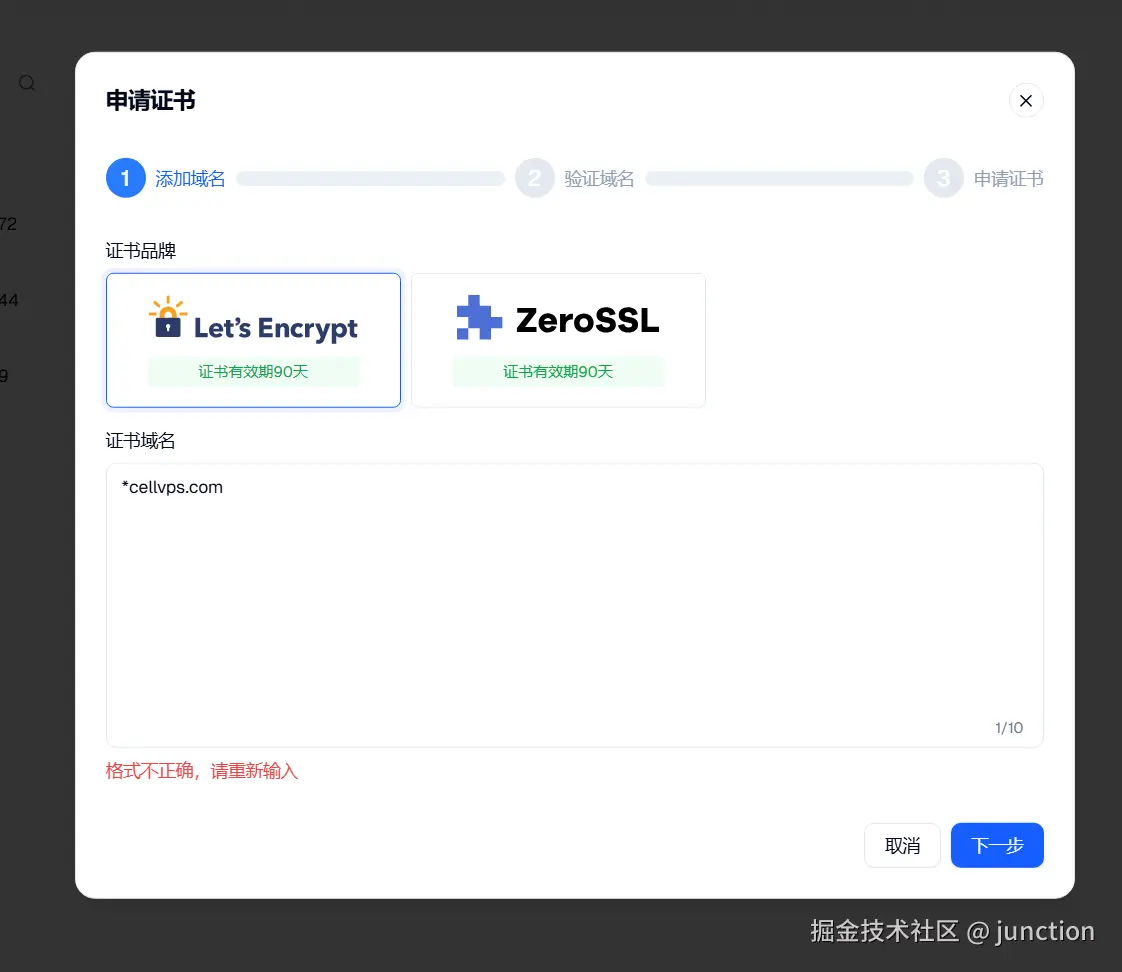 输入*.你购买的域名,点击下一步