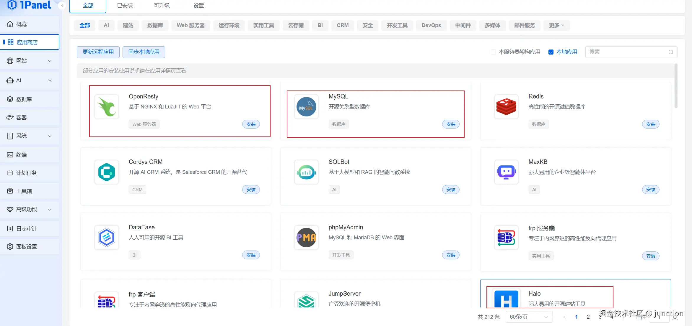 接下来我们需要安装1Panel面板,安装教程在本博客另一篇文章《如何安装1Panel服务器可视化管理面板》,大家自行参考,登录进来后进入应用商店,安装如下三个软件,注意需最先安装MySQL后再安装其余两个,安装时MySQl和OpenResty均选用默认设置,如弹出外部访问窗口未勾选,不用管,点击确认即可。