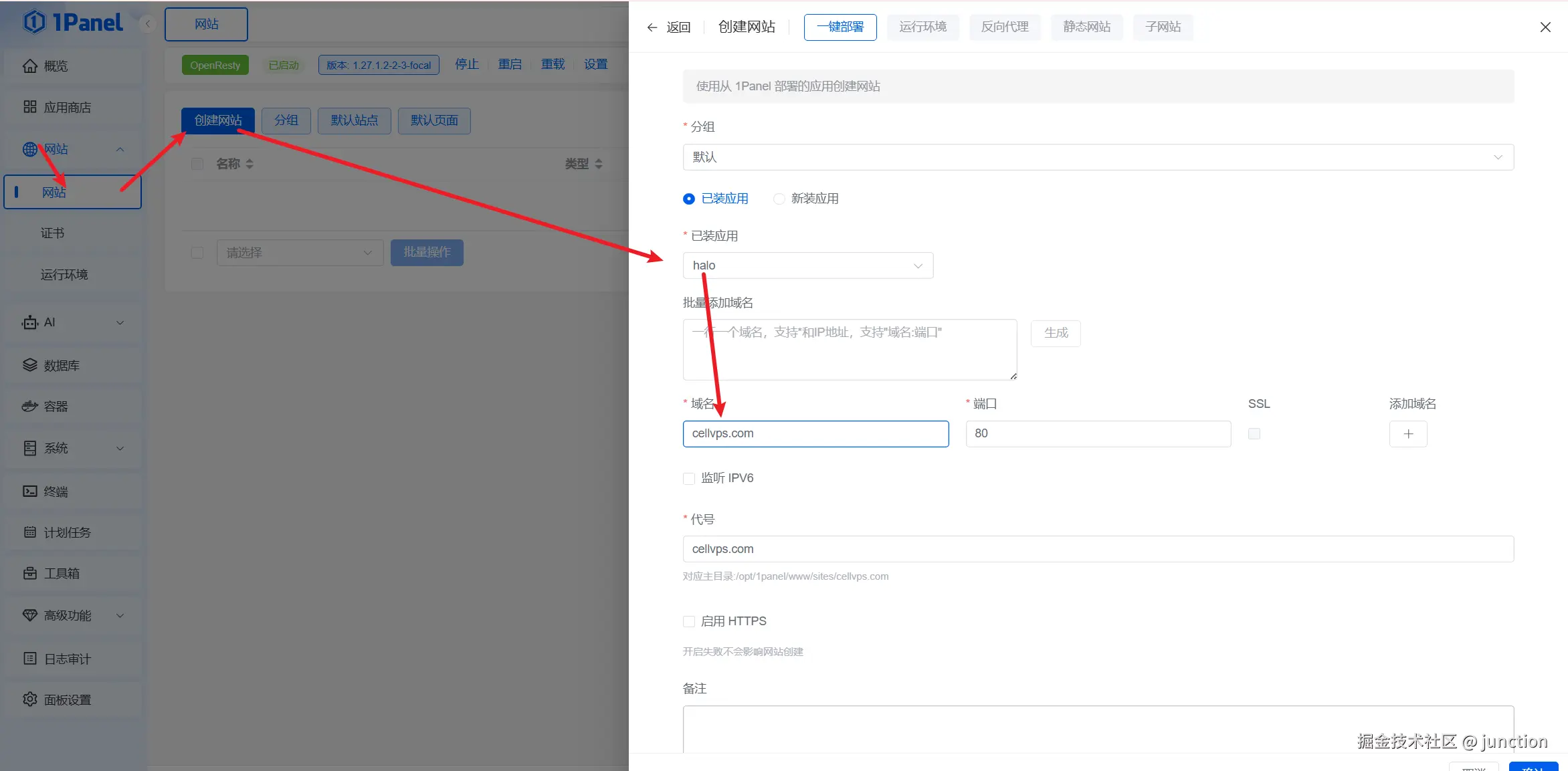 随后我们进行网站配置,点击网站,点击创建网站,选择已装应用halo,如果显示无,先点击新装应用再切换回已装应用就可以了,域名写之前我们已经购买并解析好的域名,端口默认80,随后点击确认。