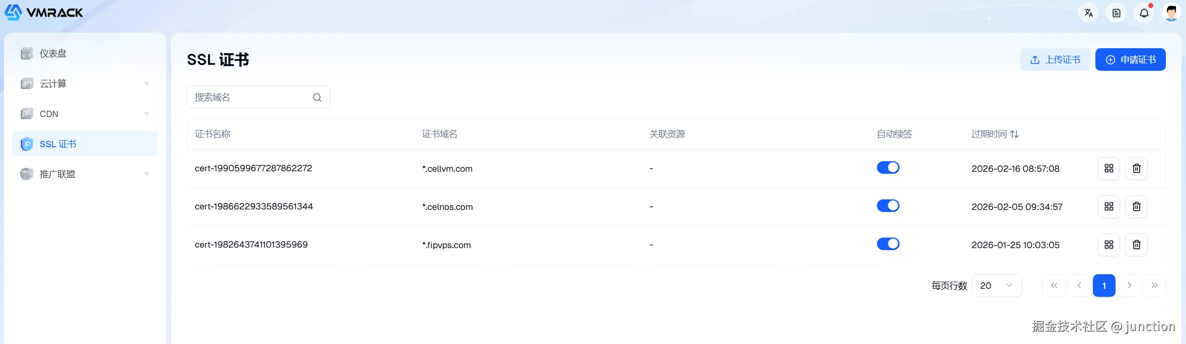 大多数云服务器商都提供SSL证书申请服务,我这里以我使用的云服务器品牌商VMRack举例,如果其他品牌商不提供证书服务或者是申请证书比较复杂,你也可以在VMRack上申请,即使你不是在这买的云服务。
