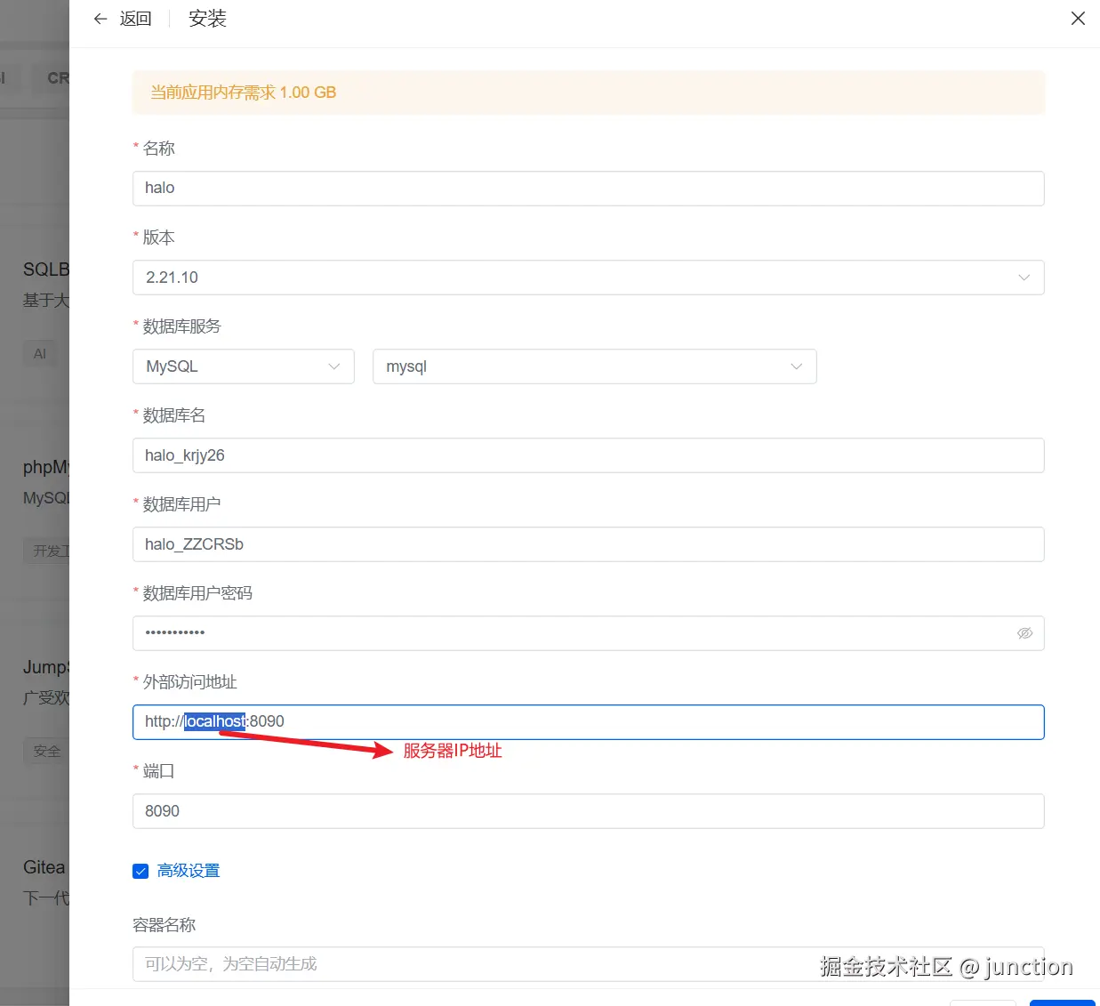 安装halo时,需将外部访问地址默认的localhost改为服务器IP地址,http://服务器IP地址:8090