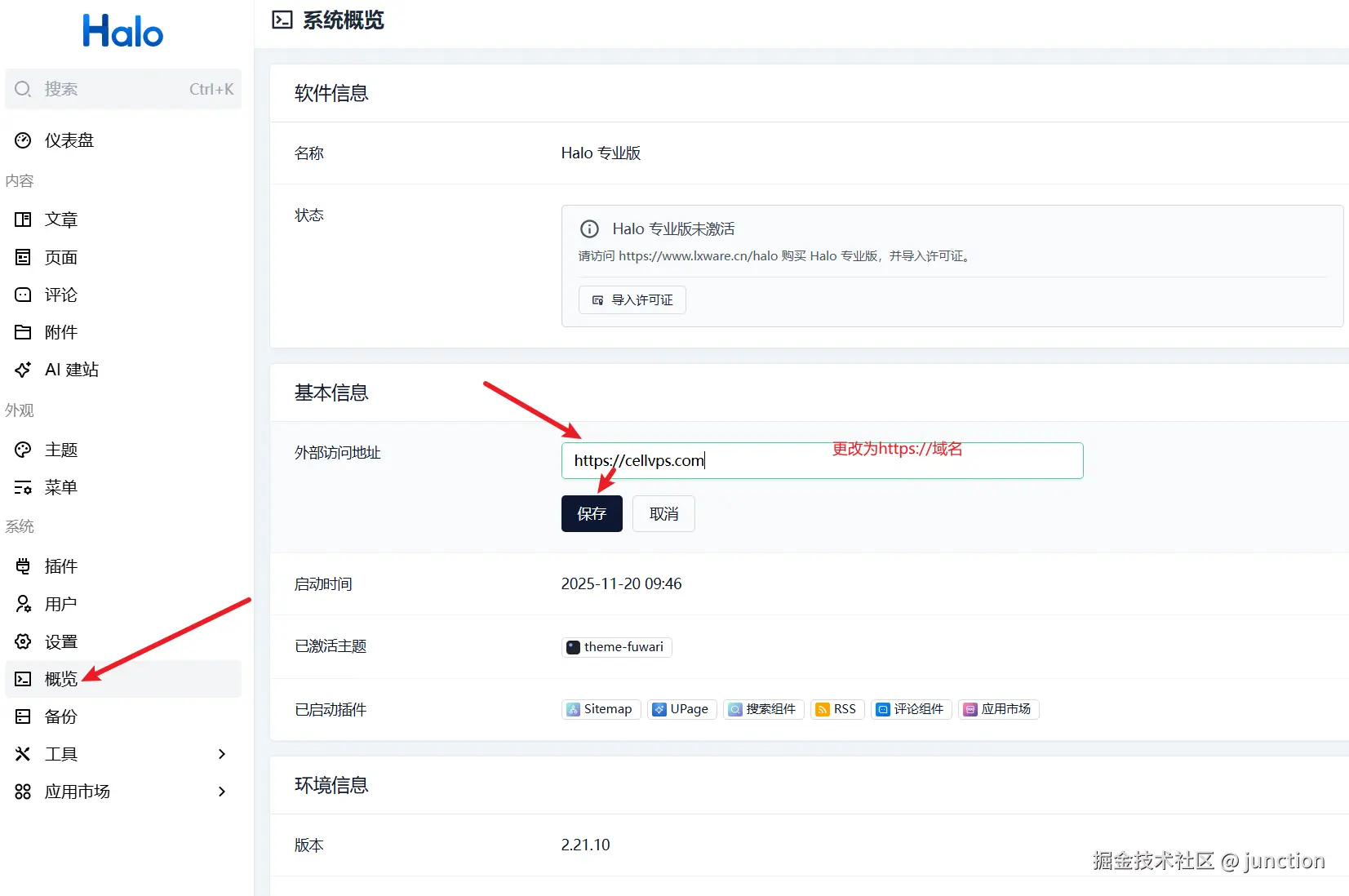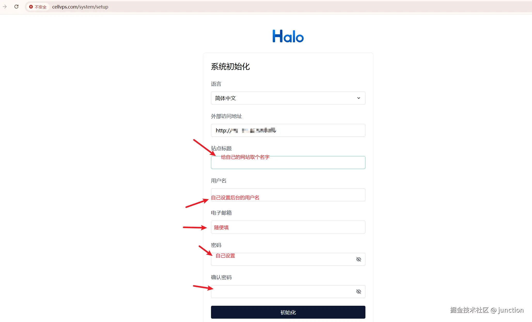 我们需要改一下halo的外部访问地址,以便于不暴露我们的IP地址,完成初始化。
