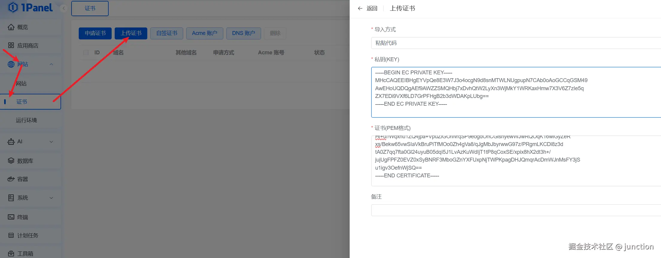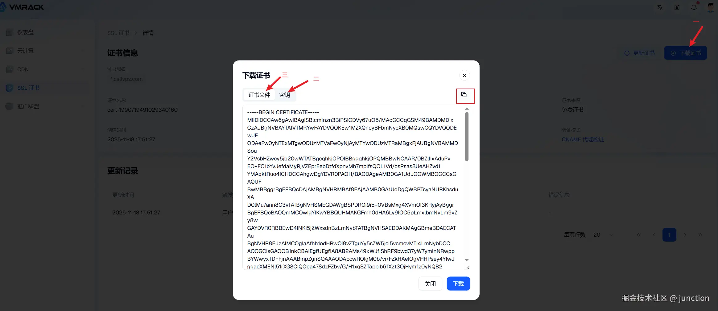 随后我们需要把第一章申请的证书上传到1Panel上,来到VMRack官网,来到控制台点击证书点击下载证书,然后把证书和密钥复制到1Panel去,注意是复制不要点击下载。