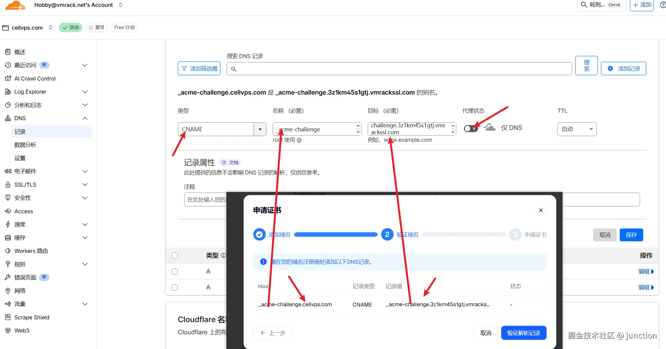 把名称和记录值复制到Cloudflare上去,记录值选择CNAME,代理状态选择关闭
