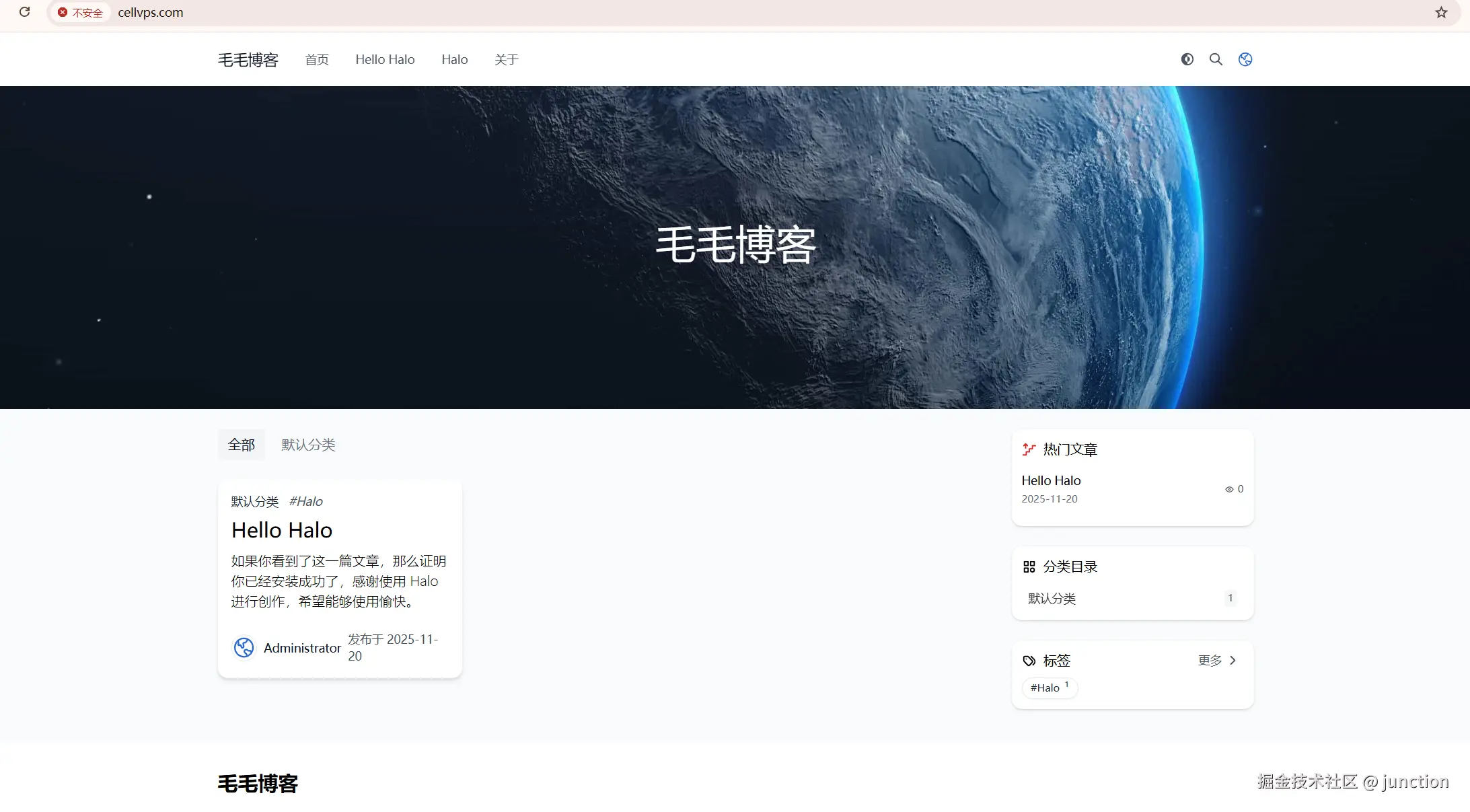 初始化后,后面在输入域名则会直接进入你的网站,网站会有一个默认的Earth主题,和一些默认的设置,如果想再次进入后台则需要输入域名/console。