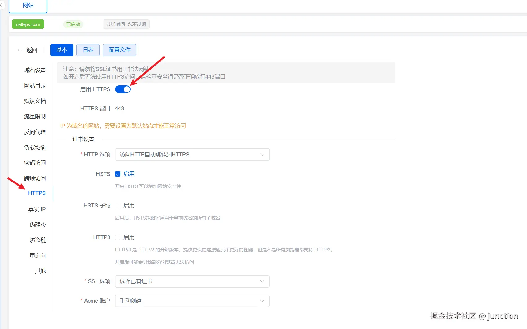 进入配置后,点击HTTPS,点击启用,因为我们已经上传过证书,下面会自动给我们配置好,随后确认即可,这一步的作用是当别人访问**http://域名.com**时会自动跳转为https://域名.com。https协议相比于http协议来说更加的安全,更能够获得浏览器和用户的信任。