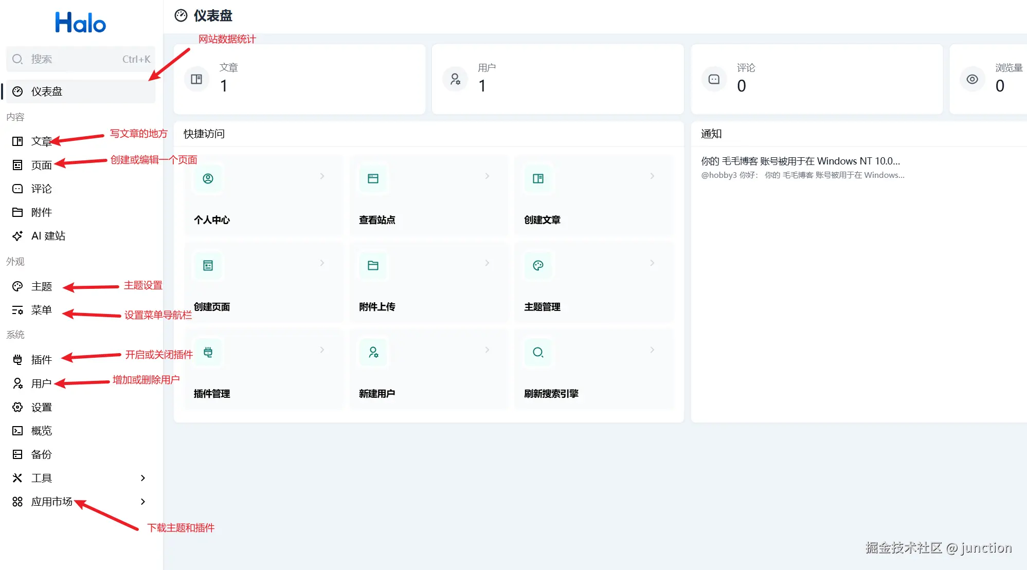 进入halo后台以后,我们可以看到整个界面非常干净而且有非常多的功能,这里我简单介绍一下,其他大家自行探索。