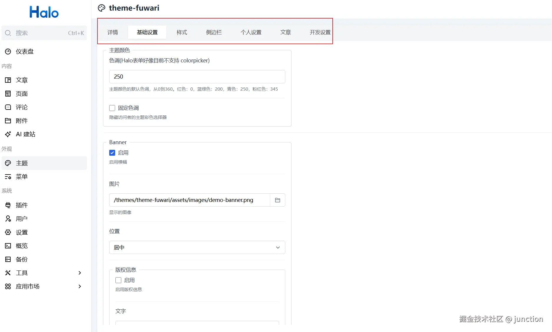 启用过后我们可以看到,主题有很多的设置,每个主题都是不同的设置,支持大家自定义,如果没有想要的功能,更换一个主题即可。
