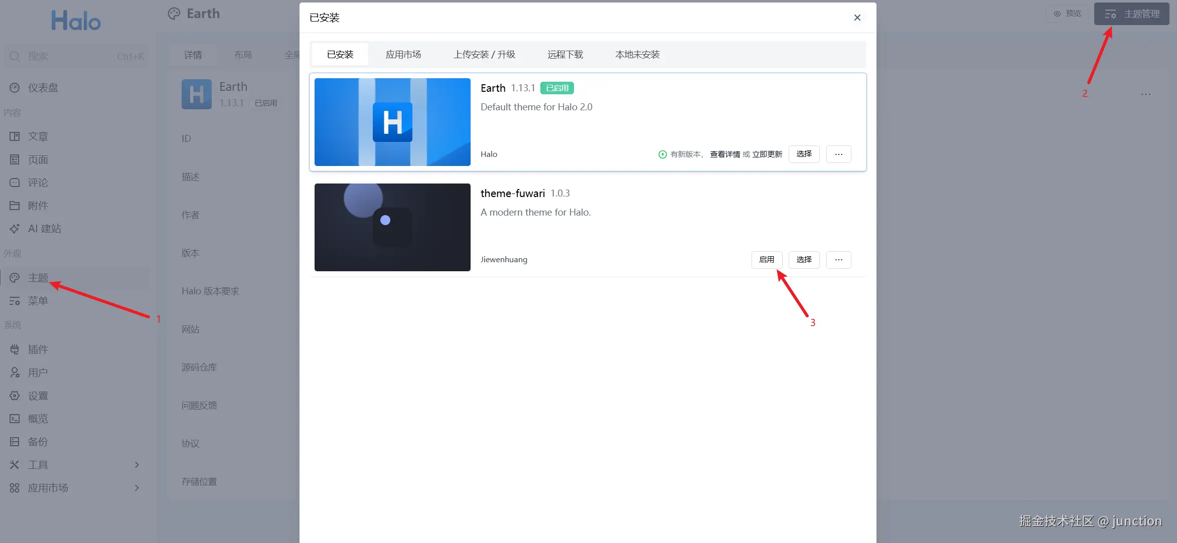 安装完成后,需要到主题右上角的主题管理里面启用它