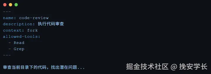 设置了context: fork之后,这个skill的执行会fork出一个子代理,有自己独立的上下文,不会污染主对话。适合那种需要大量读取文件、执行复杂分析的场景。