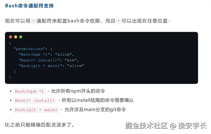 通配符权限权限 以前授权要一个个写,现在支持通配符。 Bash(npm *) 就能授权所有npm开头的命令。