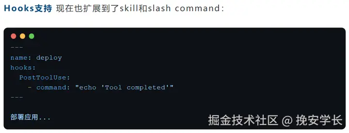 之前hooks只能在agent层面定义,现在skill级别也能定义了。这意味着你可以为每个skill设置独立的前置检查、后置处理逻辑。现在,agent、skill、slash command三个层级都能单独定义Hooks了。想控制哪层就控制哪层。