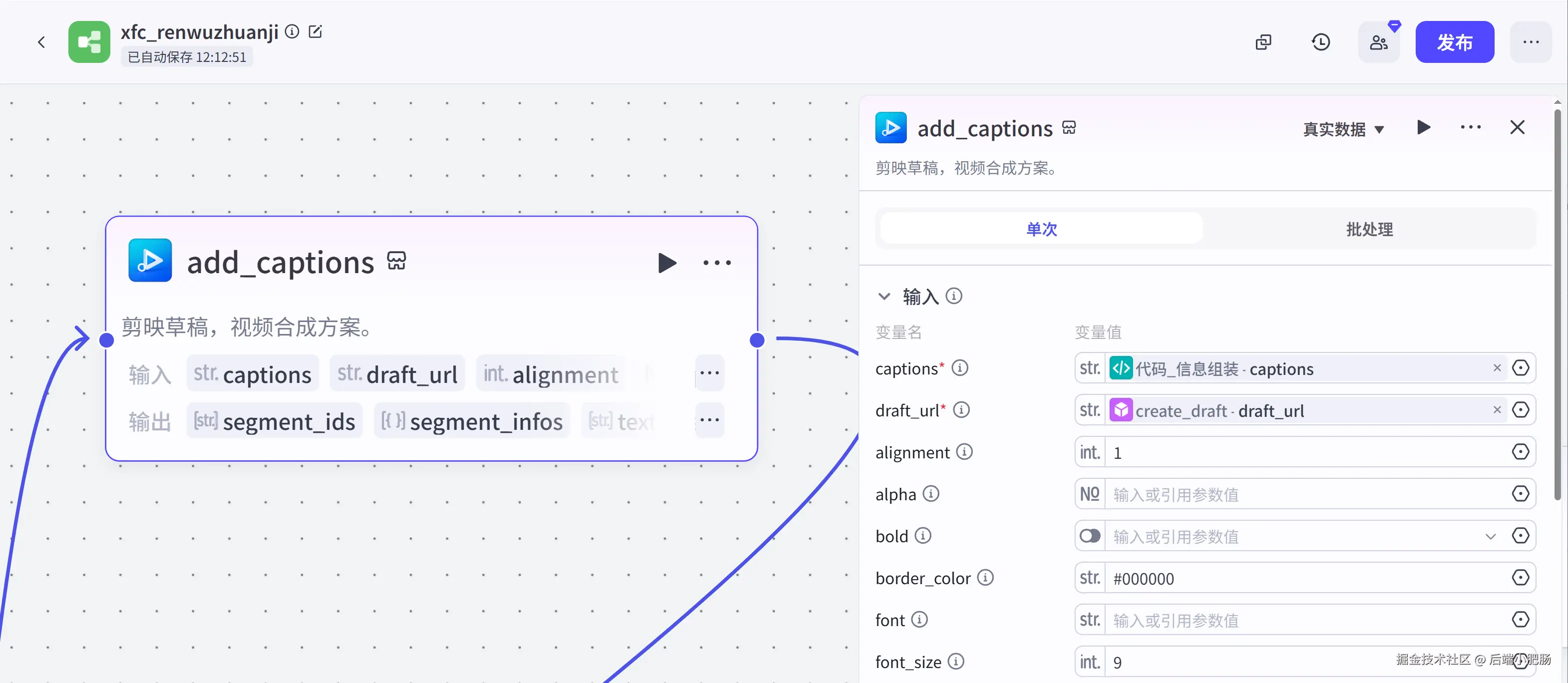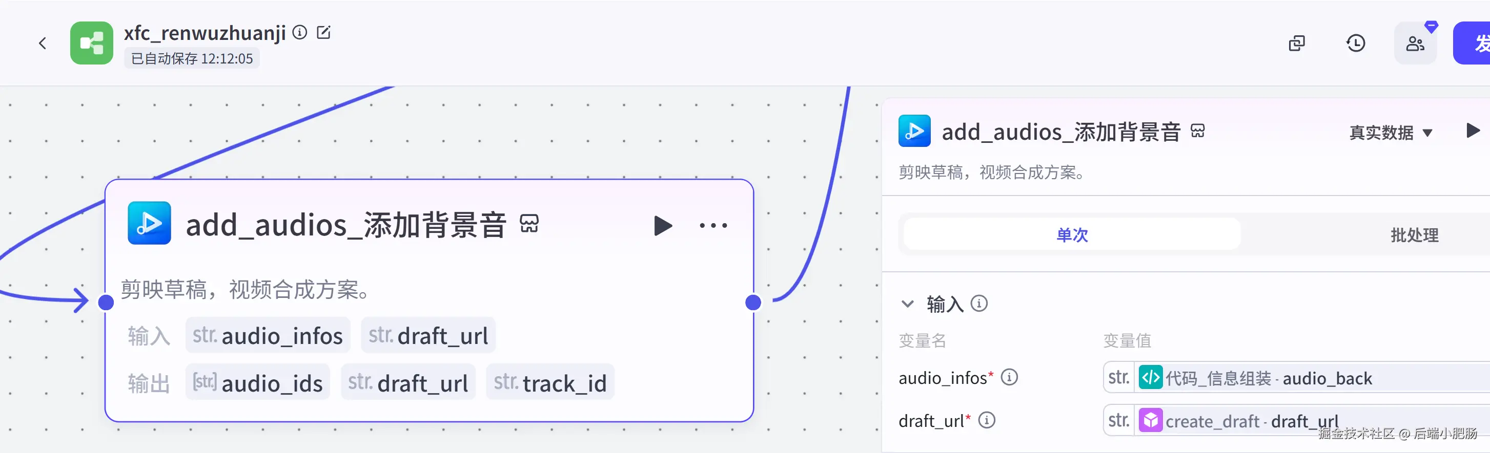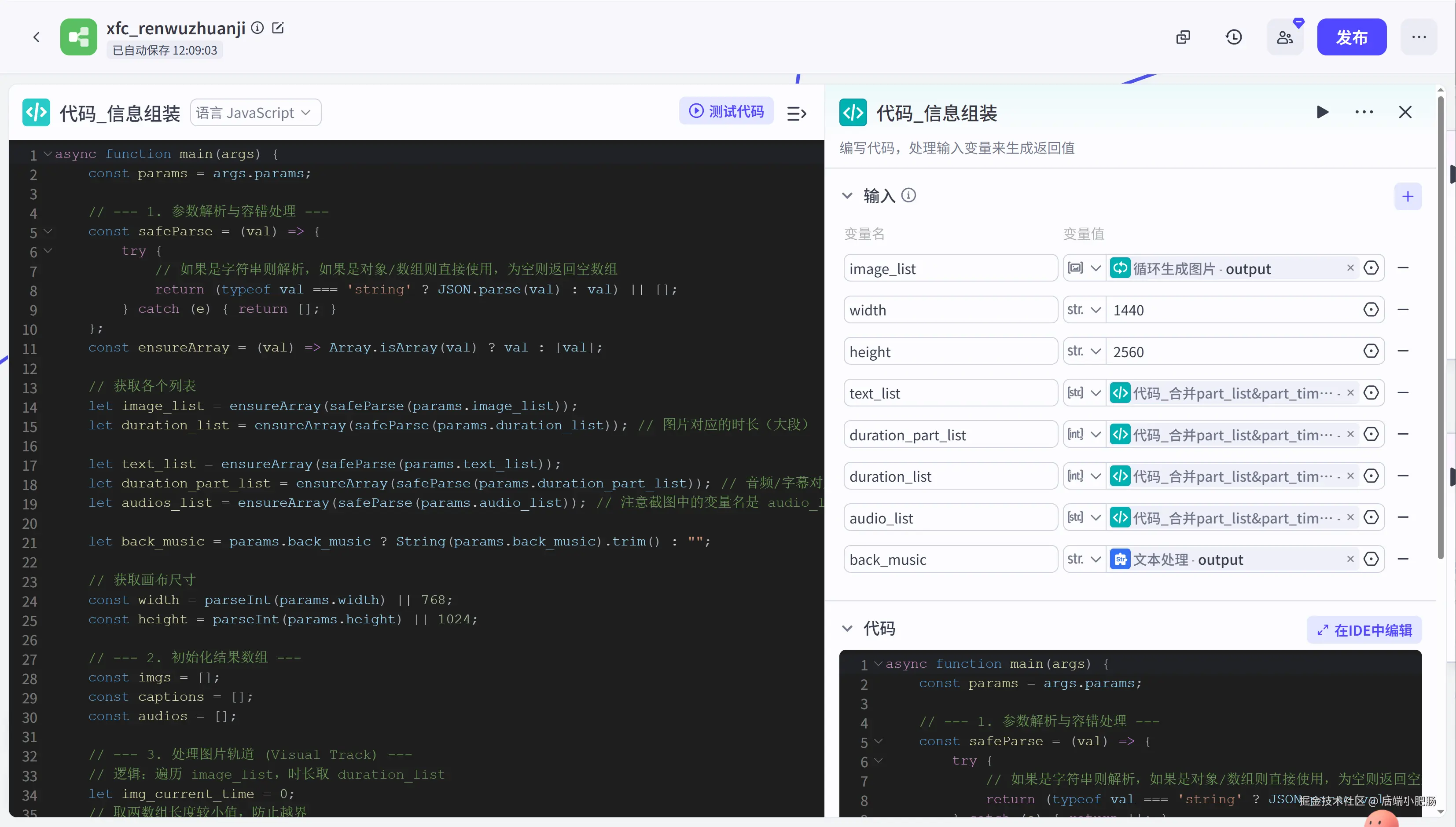 信息组装代码: 在前置节点中我们生成了图片,背景音乐,配音,字幕这几个视频要素,该节点就是将前置生成的视频要素进行数组格式规整,成为视频剪映小助手需要的格式。这一步也可以用插件节点来实现,看你自己。