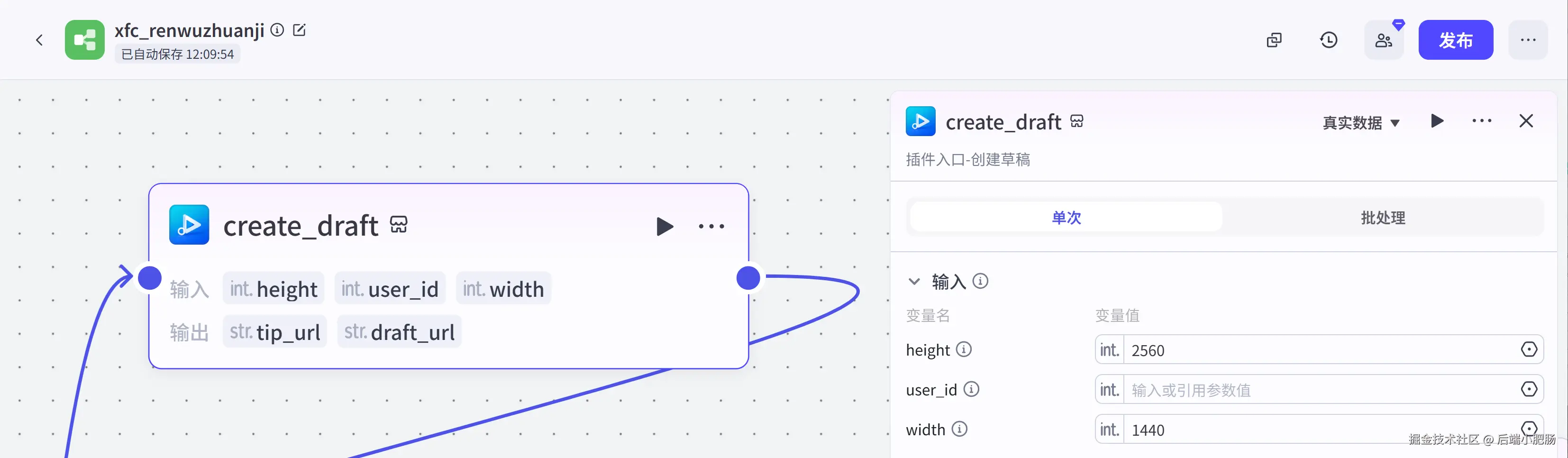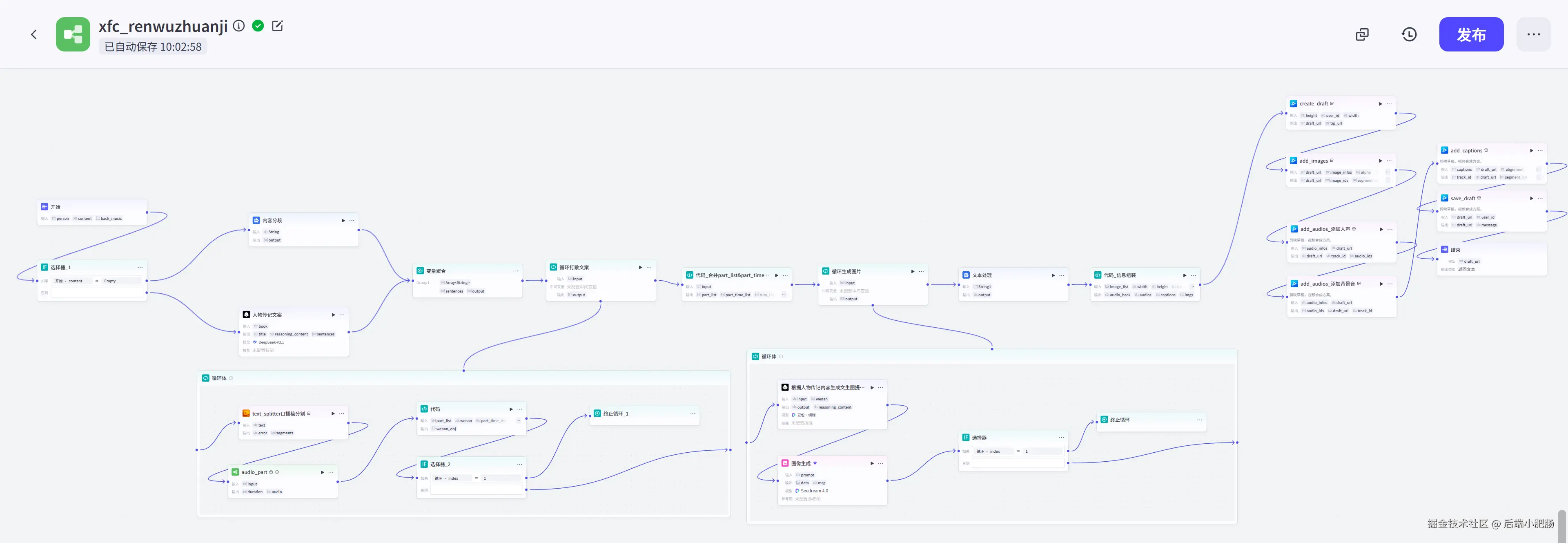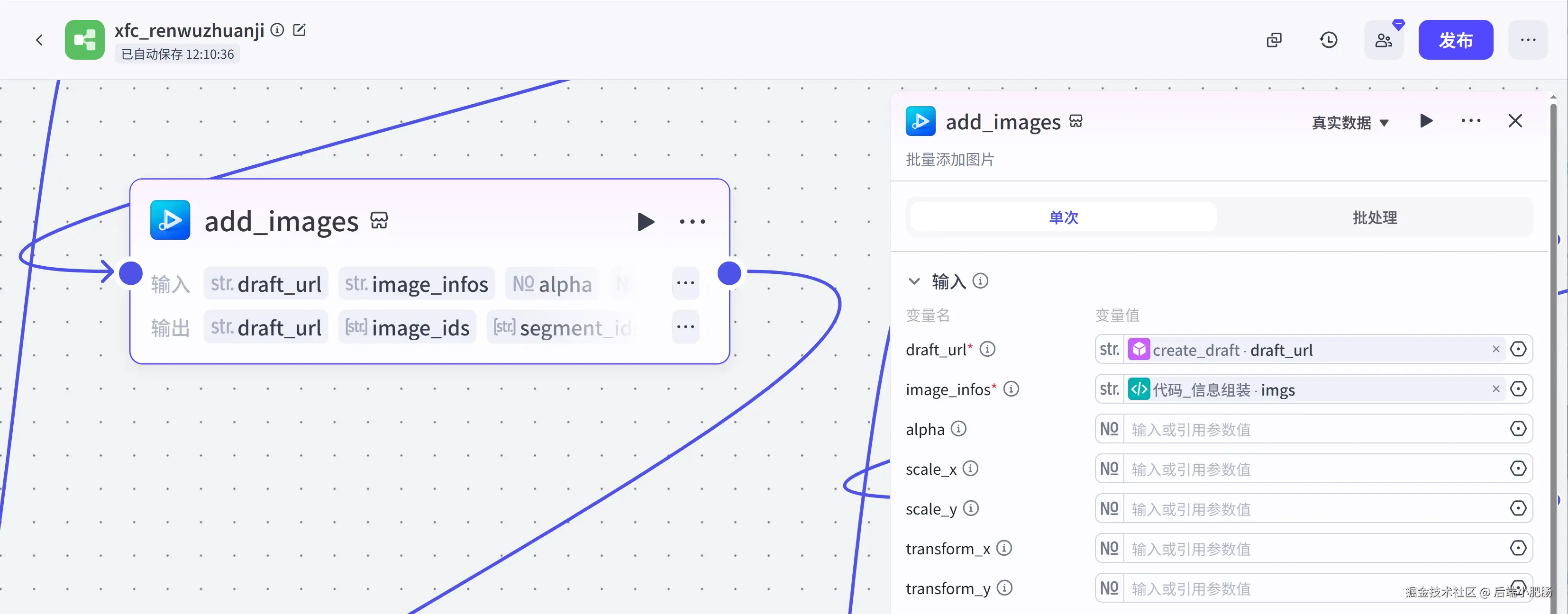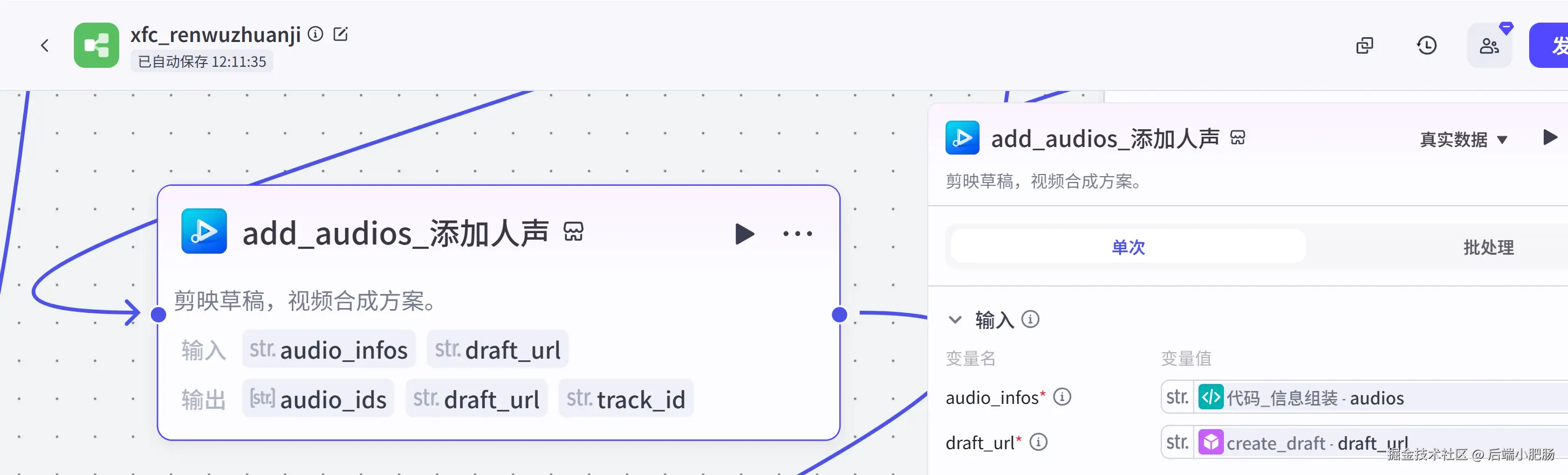 信息组装代码: 在前置节点中我们生成了图片,背景音乐,配音,字幕这几个视频要素,该节点就是将前置生成的视频要素进行数组格式规整,成为视频剪映小助手需要的格式。这一步也可以用插件节点来实现,看你自己。