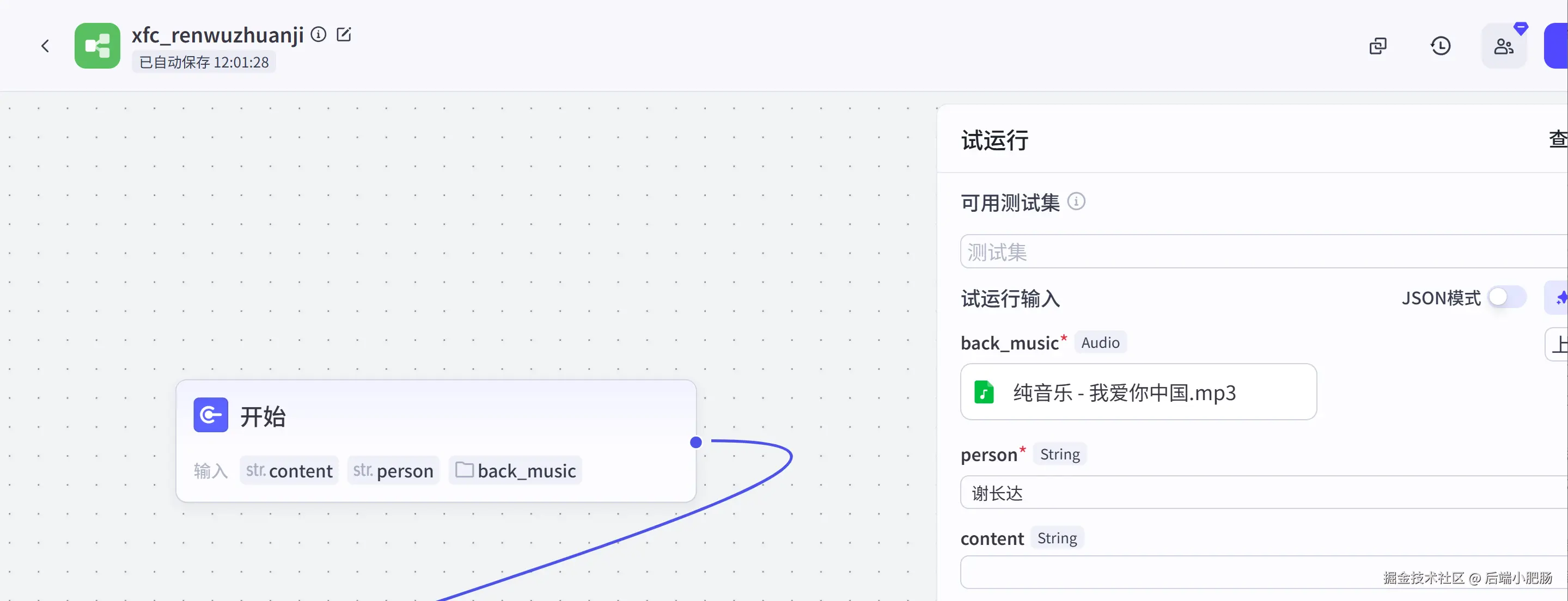 开始节点: 开始节点传入的参数主要有back_music文件(.MP3),person(人物名字),content(视频文案,如果你想自定义文案可以直接传入)。