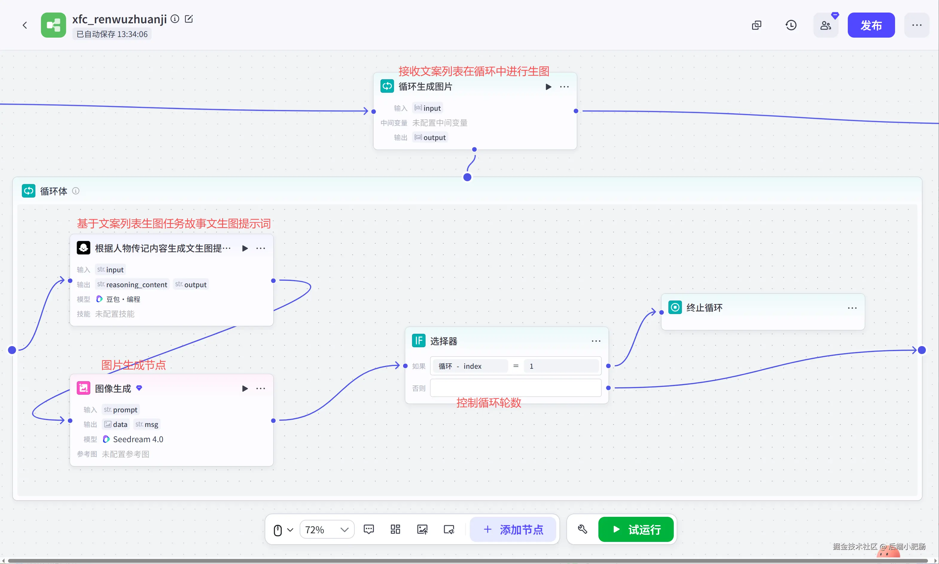 循环生图—根据人物传记内容生成文生图提示词( 大模型 ): 这是一个大模型节点,采用豆包编程模型,它的核心是根据传入的文案来生成人物故事文生图提示词。