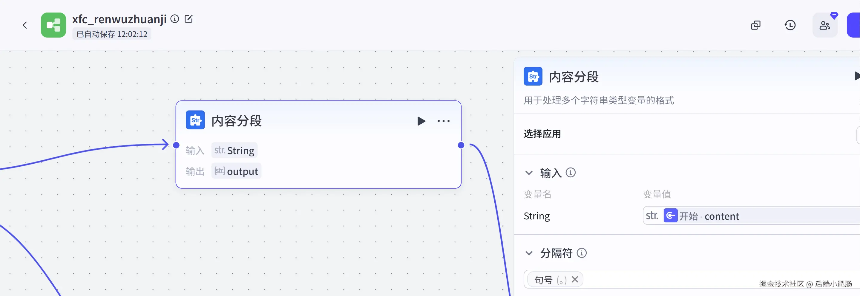 内容分段: 这是一个文本处理节点,它的作用是基于句号对用户输入的文案进行分隔,成为字符串数组。