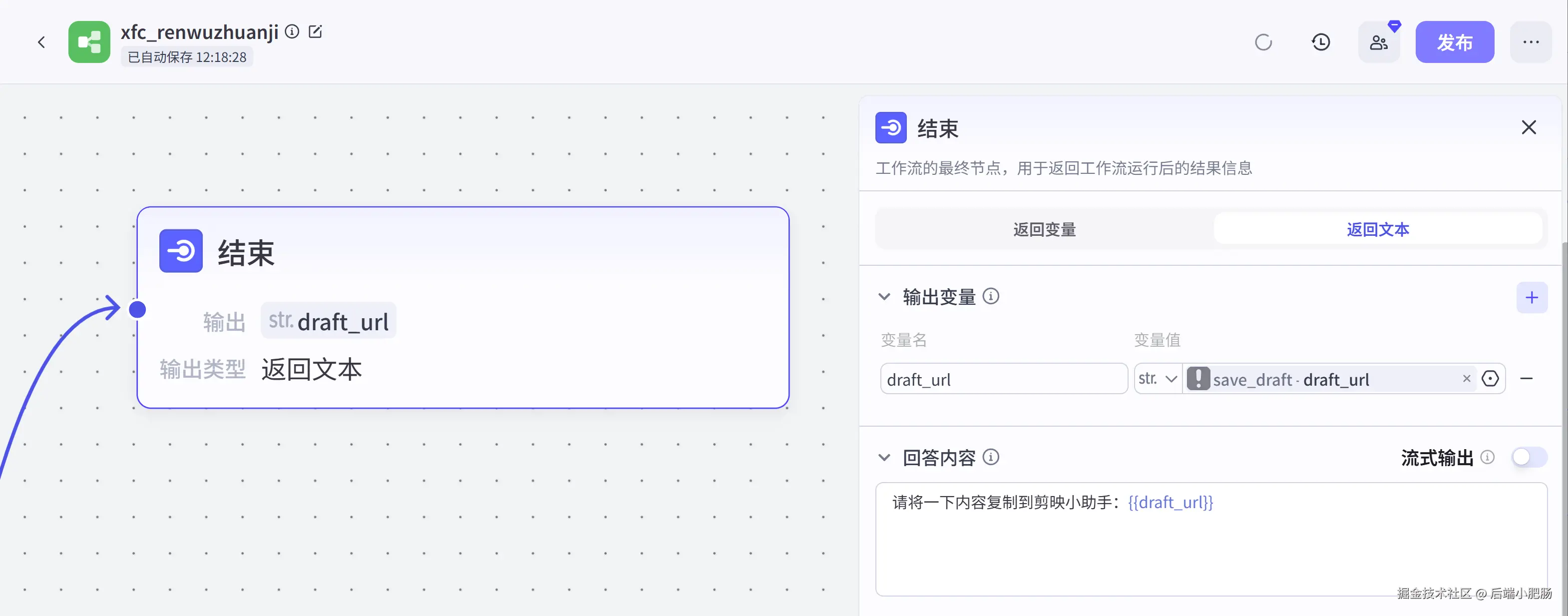 结束节点: 结束节点接收的是save_draft节点输出的剪映草稿,可用于合成最终视频。