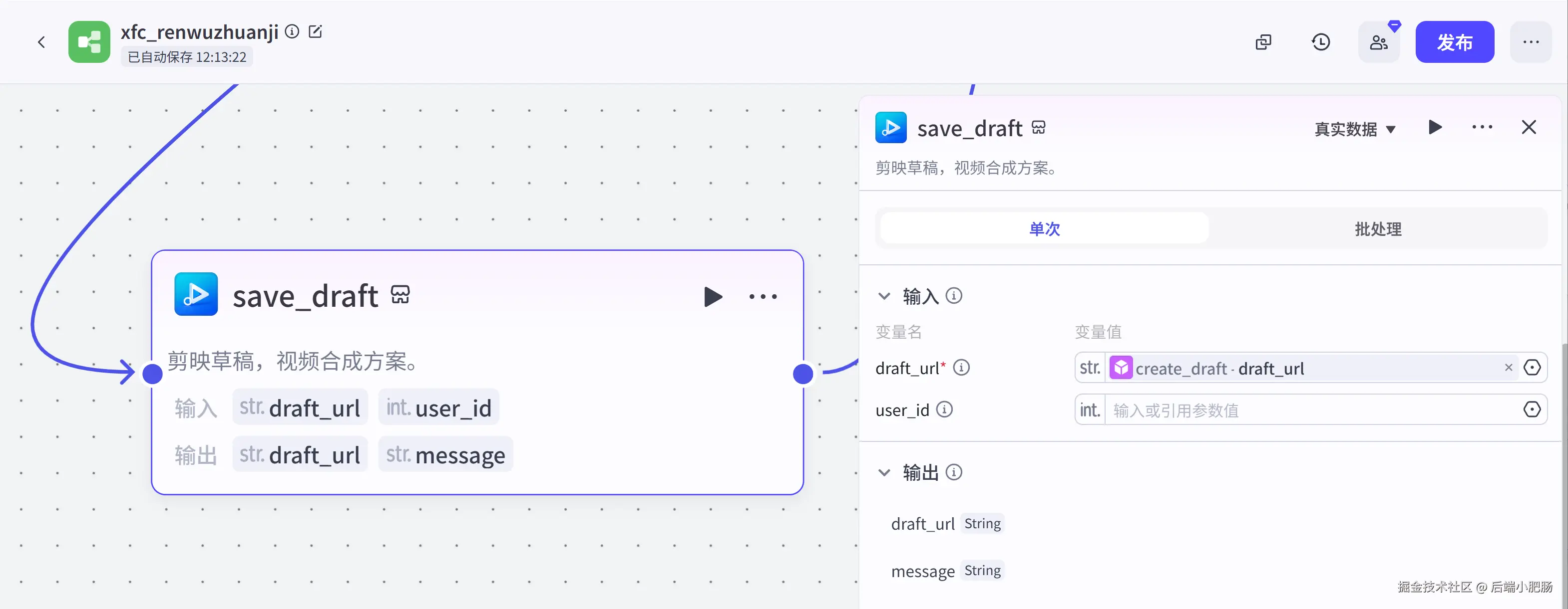 工作流的使用方法很简单,只需要在开始节点输入人名,自定义文案(非必填),背景音乐,等待几分钟即可获得剪映草稿: