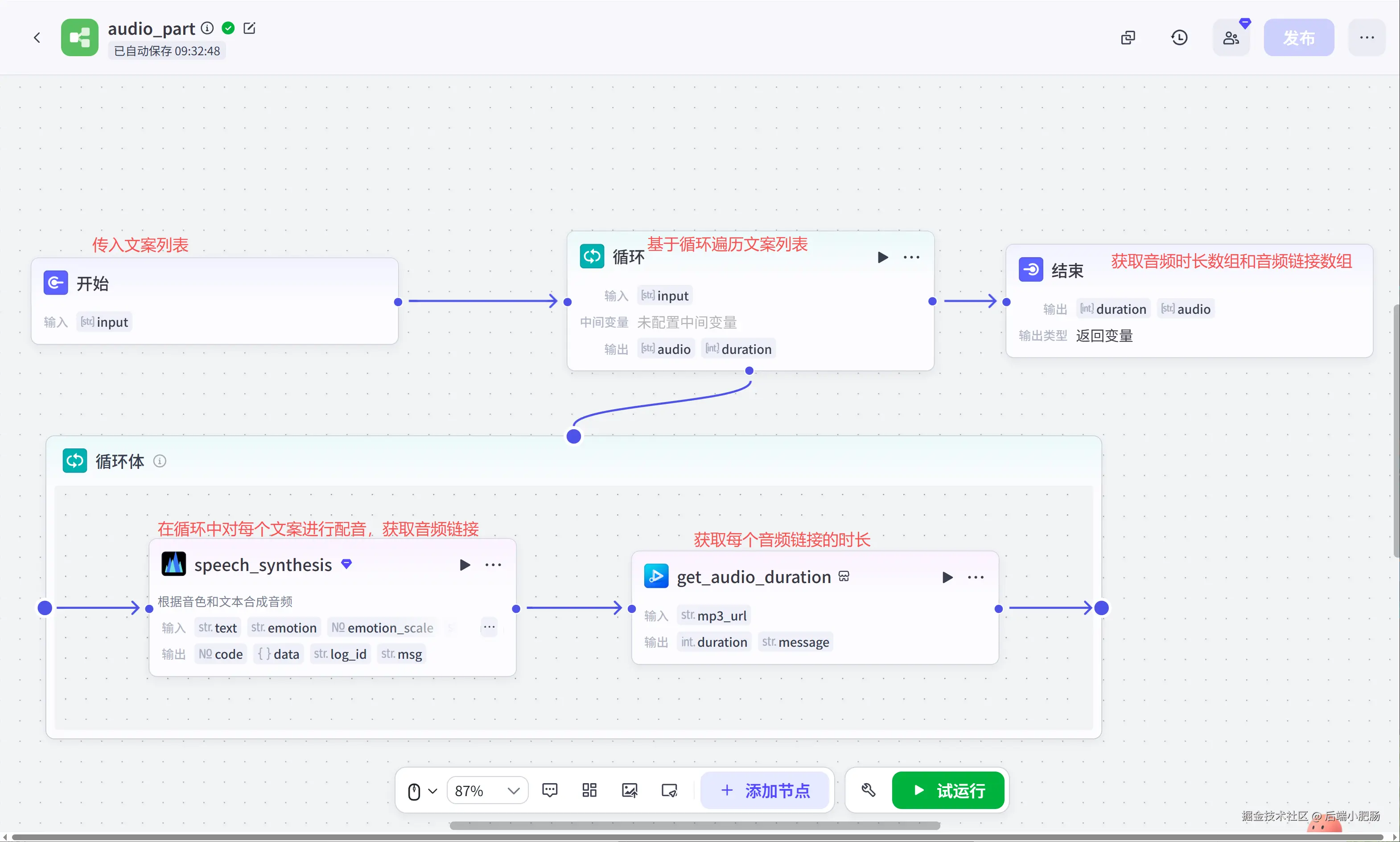 audio_part(文案配音与获取时长子 工作流 ): 这个工作流主要是处理基于text_splitter口播稿分割打散后的文案进行配音和获取配音时长操作。