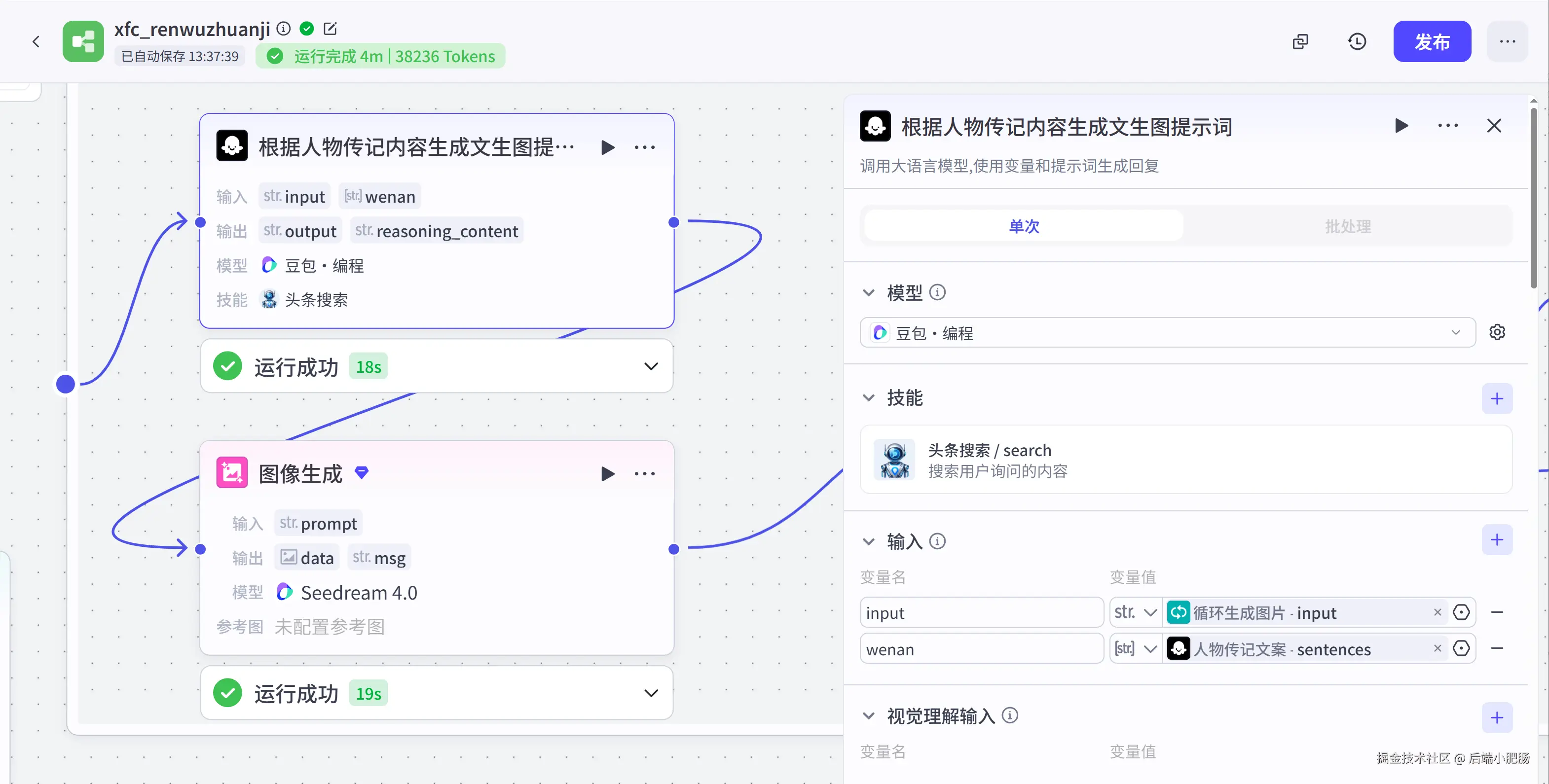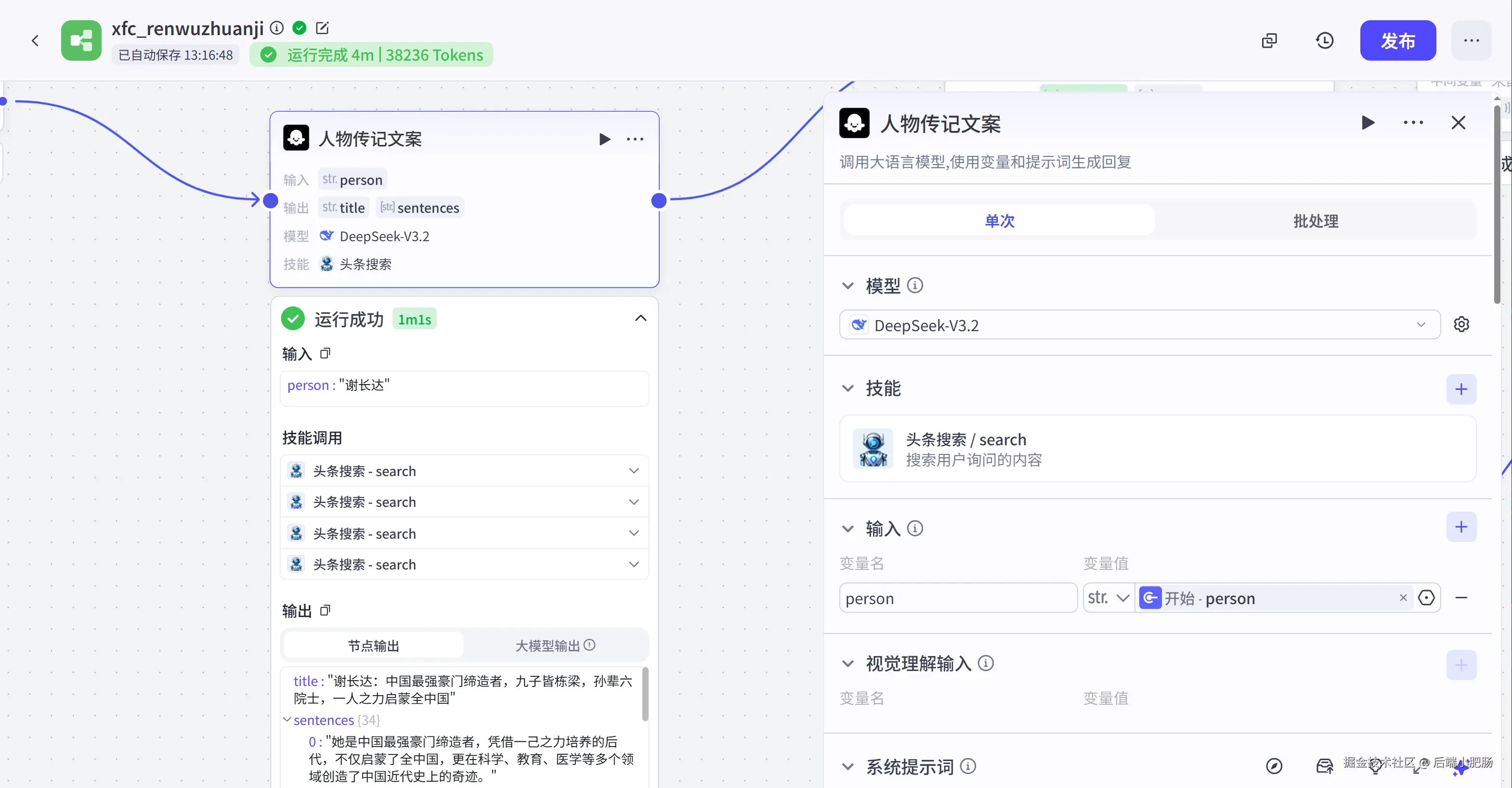 人物传记( 大模型 ): 这是一个大模型节点,它的作用是基于开始节点传入的人名来生成人物故事视频文案,采用了DeepSeekV3.2大模型,注意在技能处要加一下搜索插件,这样出来的文案更贴实际。