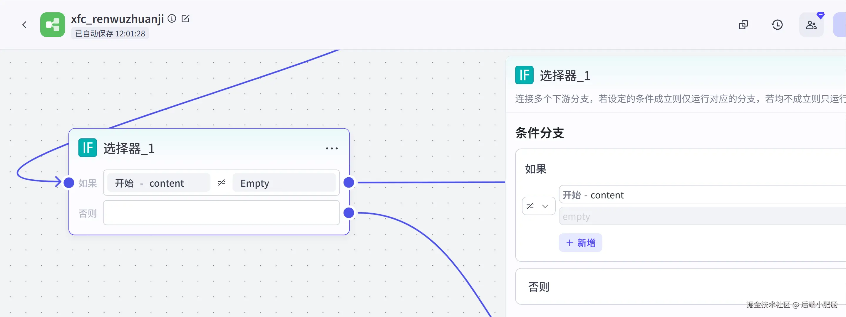 选择器: 这个节点位于开始节点后,接收开始节点传入的content,判断content是否为空,若为空则调用下游大模型节点创建视频文案,否则基于文本处理节点对文案内容进行分段。