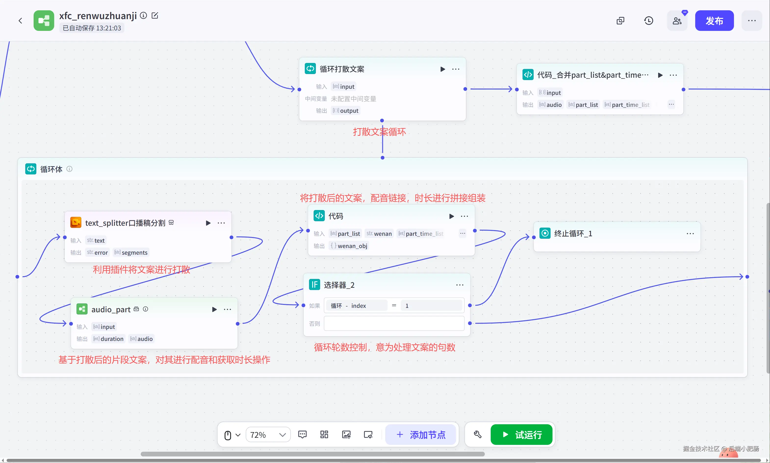 循环文案打散: 前置人物传记( 大模型 ) 节点生成的文案列表中,一句话占用的时间比较长,我们要将它进行一个打散的操作,然后统计每个小文案片段的时长,求取他们的时间游标,为后续添加到剪映草稿做前置准备。