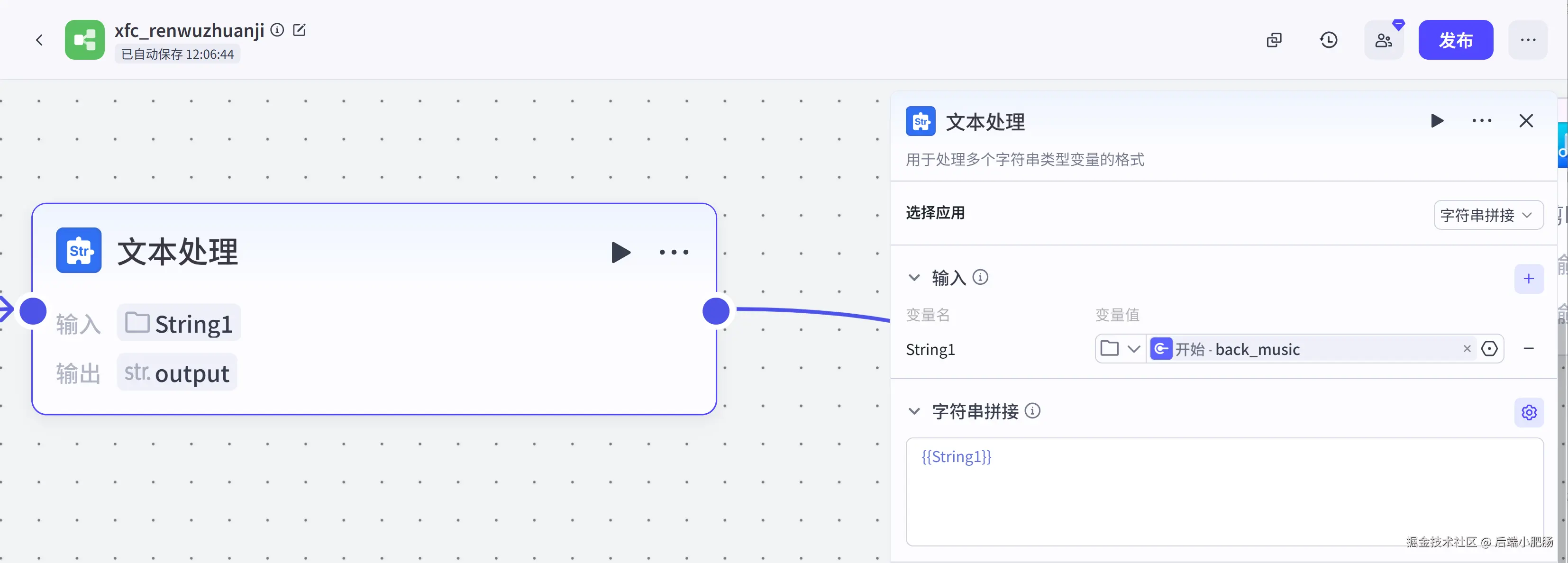 文本处理(获取背景音乐链接): 这个节点是文本处理节点,它的功能是根据开始节点上传的.mp3背景音乐提取音乐文件链接地址。