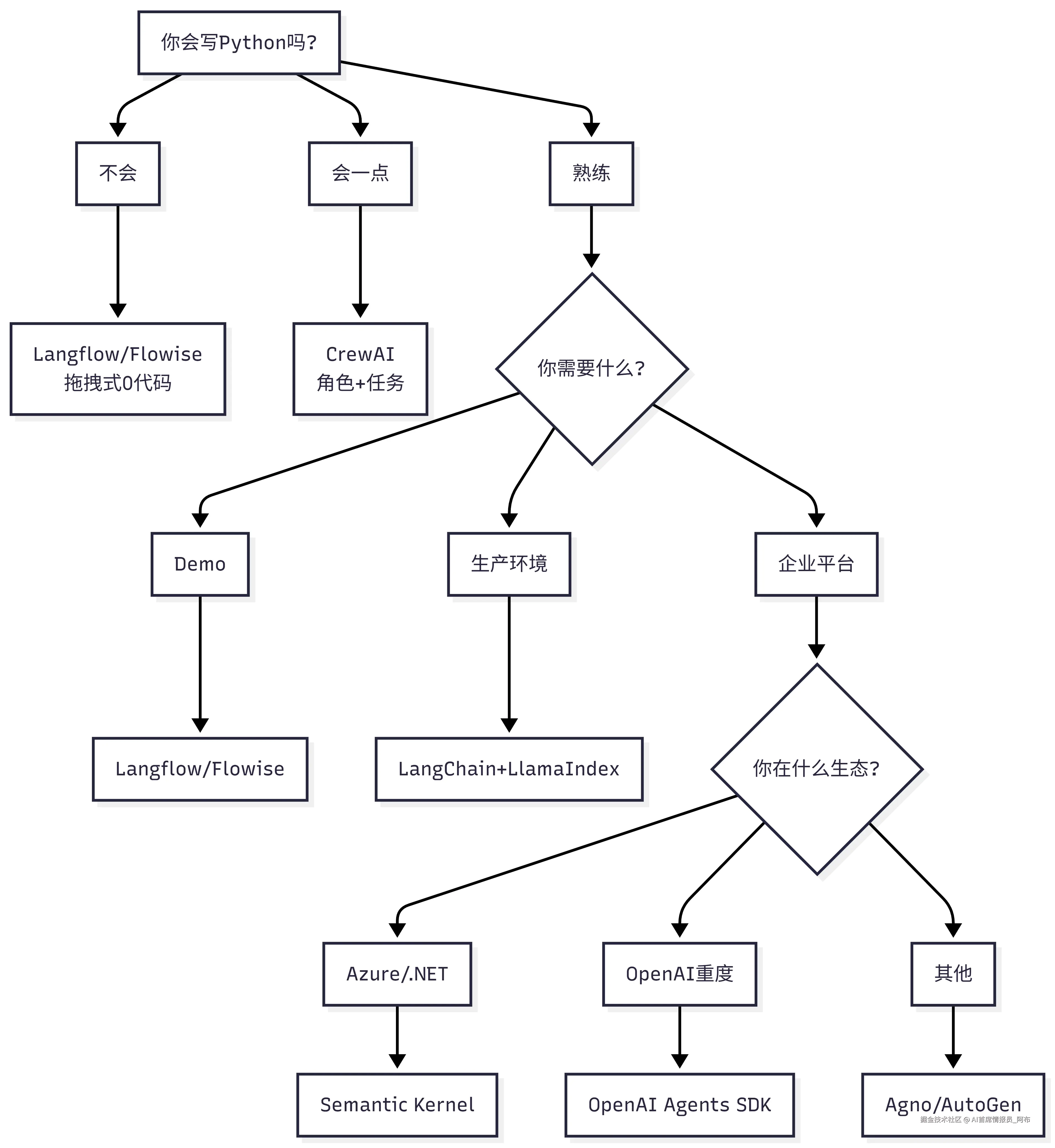 | 盲目追新 | 选"头部 + 生态好"的:LangChain、LlamaIndex、AutoGen |