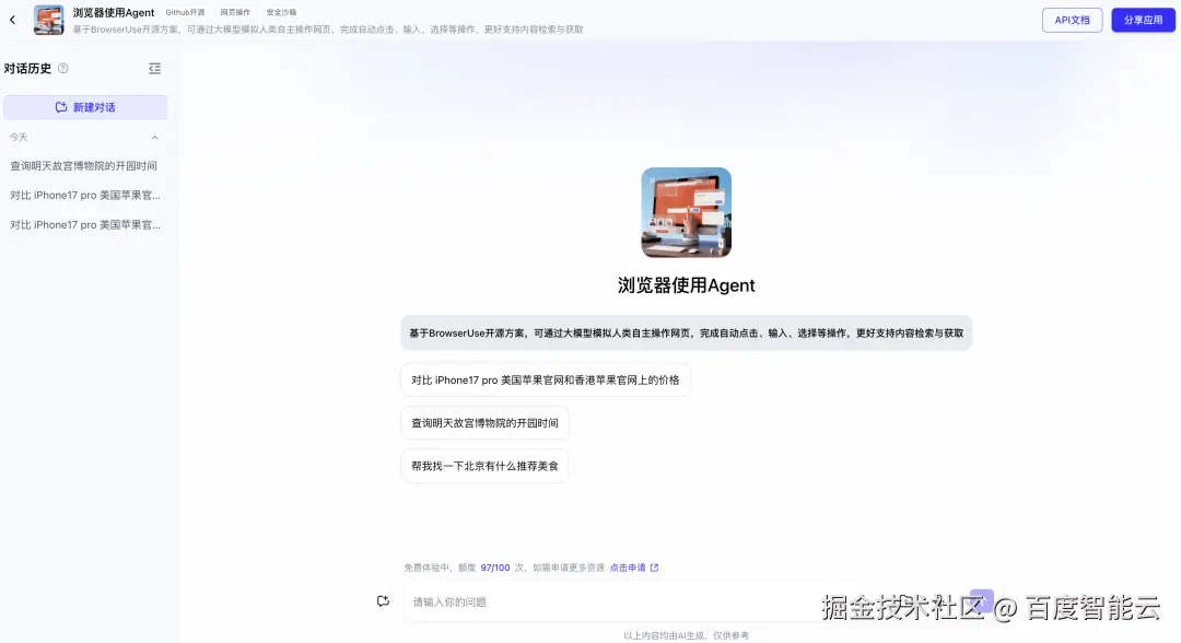- ****浏览器使用Agent全新发布:****基于BrowserUse开源方案,可通过大模型模拟人类自主操作网页,更好支持内容检索与获取,支持通过API进行集成使用。