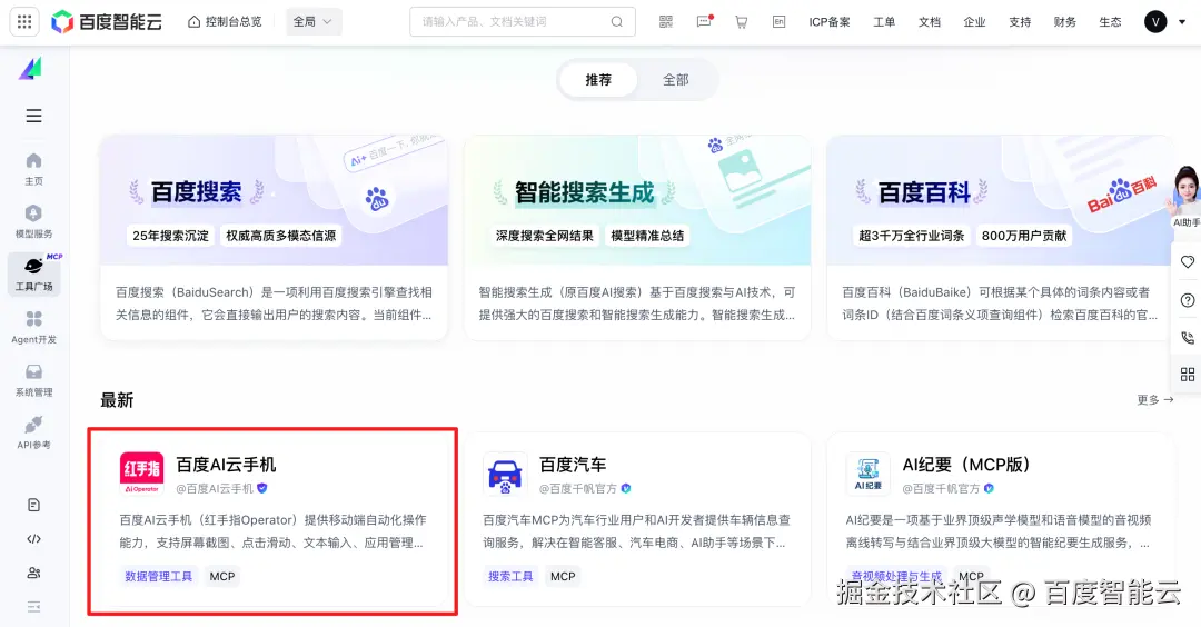 - 百度AI云手机(红手指Operator)MCP Server:是一个基于MCP(Model Context Protocol)协议实现的云手机控制服务,为AI Agent和开发者提供便捷高效的云手机操作能力。该服务支持通过标准MCP协议对云手机进行自动化操作,包括屏幕控制、应用管理、文本输入等功能,可广泛应用于移动端自动化测试、应用操作、智能任务执行等场景。