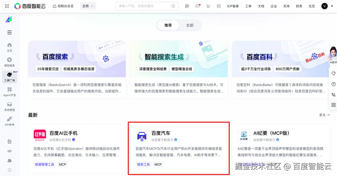 - ****百度汽车MCP:****为汽车行业用户和AI开发者提供车辆信息查询服务,解决在智能客服、汽车电商、AI助手等场景下获取准确车型信息的需求。支持精确查询具体车型的指导价、技术参数、图片配置等详细信息。查询结果来自百度搜索。