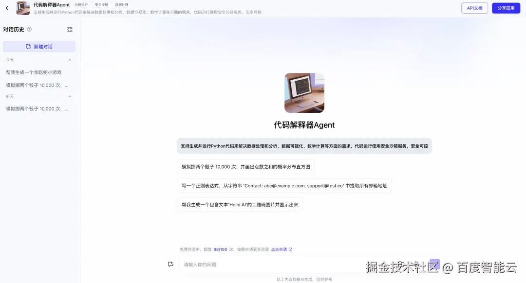 - ****代码解释器Agent全新发布:****支持生成并运行Python代码来解决数据处理和分析、数据可视化、数学计算等方面的需求,代码运行使用沙箱服务,安全可控。