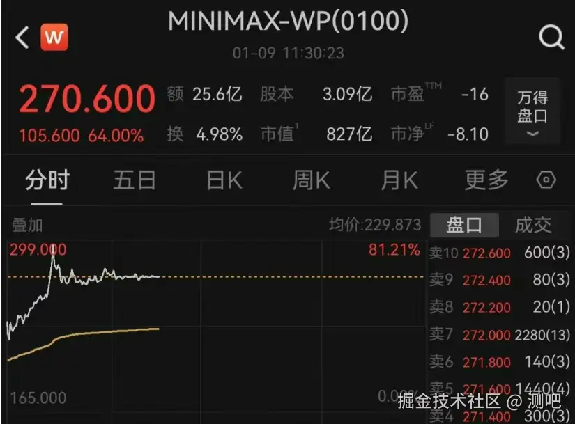 1 月 9 日,MiniMax 在港交所挂牌,开盘后股价一度暴涨超 80%,市值突破 900 亿港元。 即便回落后,市值仍稳定在 800 亿港元量级。