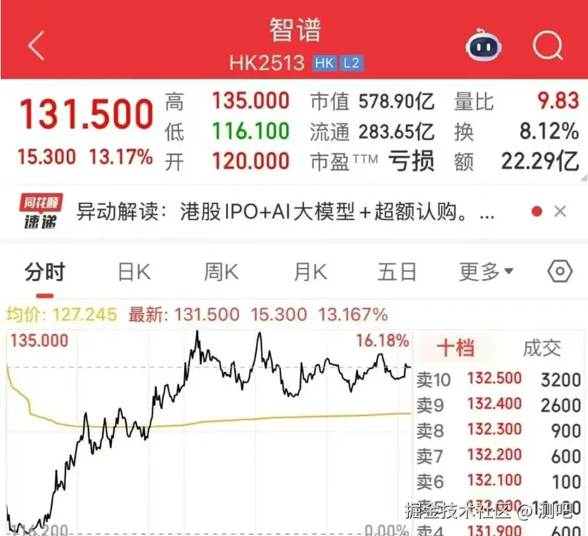 1 月 8 日,港交所锣声响起,智谱正式登陆港交所,股票代码 02513。 开盘价 120 港元 / 股,盘中最高涨至 135 港元,市值逼近 600 亿港元。