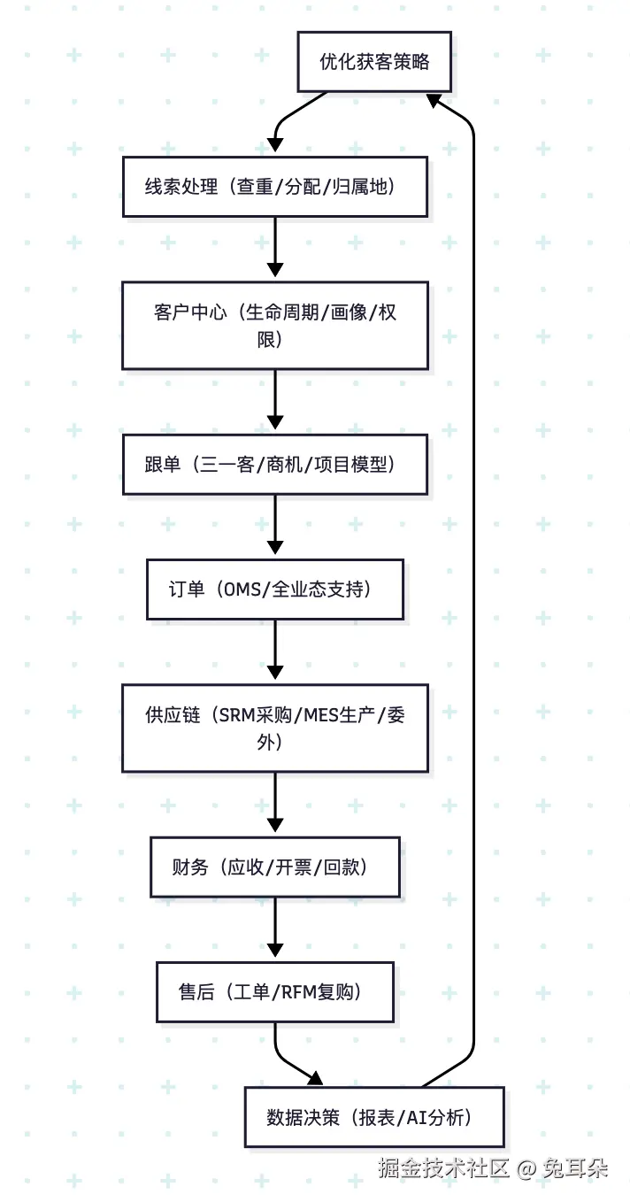 超兔是少数实现“获客-供应链-增长”全链路原生闭环的系统,流程如下: