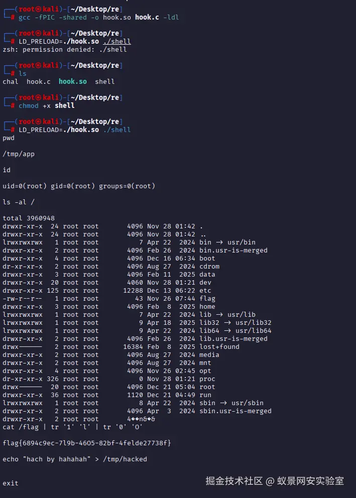# 编译为共享库gcc -fPIC -shared -o hook.so hook.c -ldl# 使用 Hook 库运行木马程序LD_PRELOAD=./hook.so ./shell