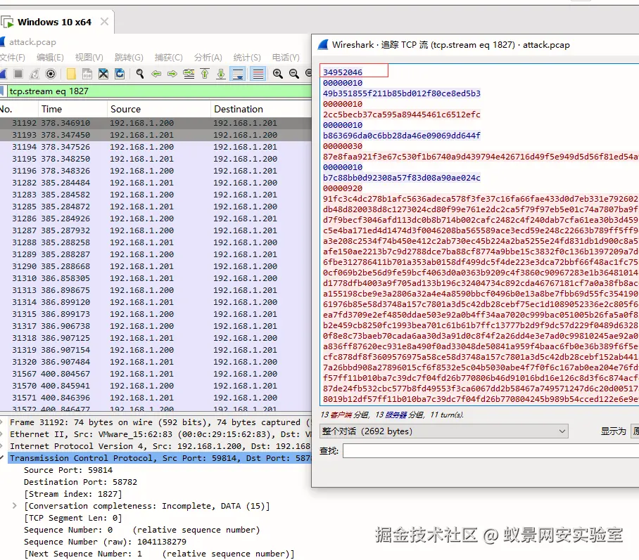 这些密文数据来自流量包中的实际通信记录,通过 Wireshark 追踪流 1827,可以获取完整的密文长度和密文序列,也就是上一题追踪到的那些,这些数据被组织成一个 DATA 数组,每两个元素为一组:第一个是密文长度的十六进制表示,第二个是对应的密文