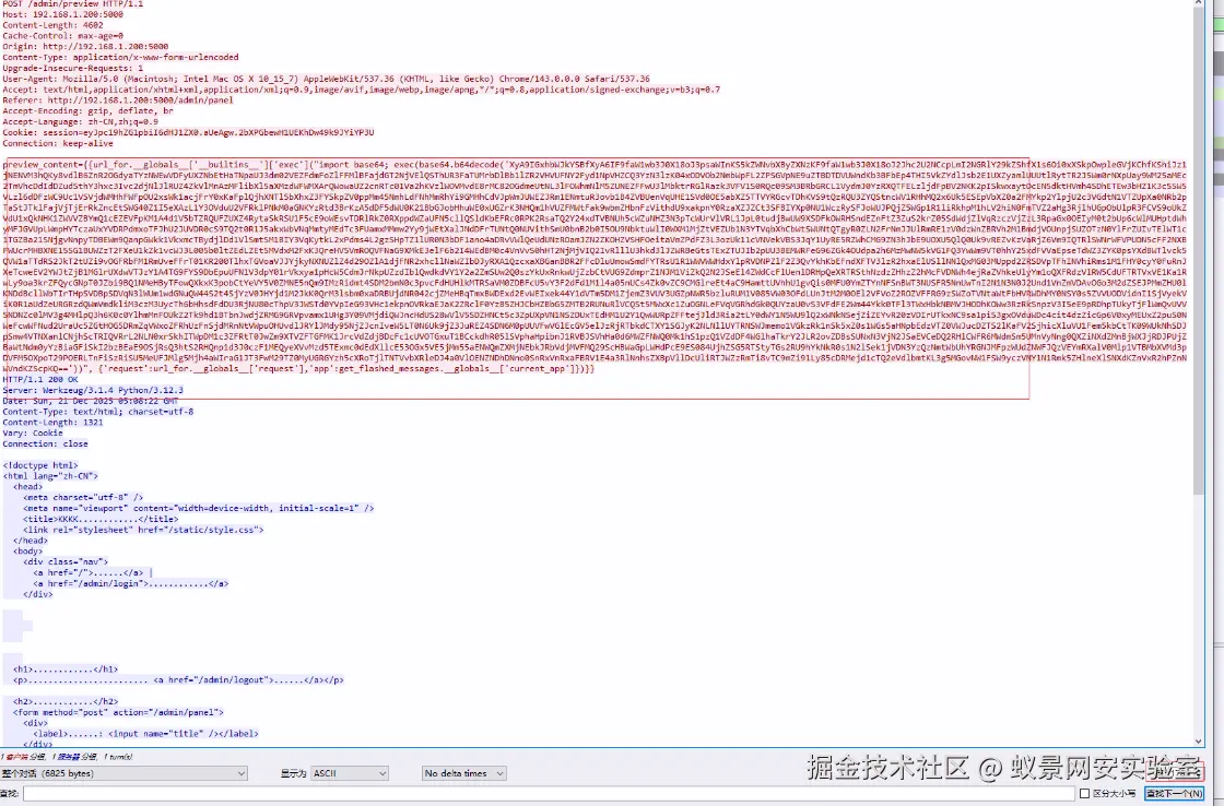 首先,内容以 {{ ... }} 包裹,正常的“预览预览”功能应该只处理纯文本或简单的 HTML,而这里提交的是 Jinja2 模板执行代码