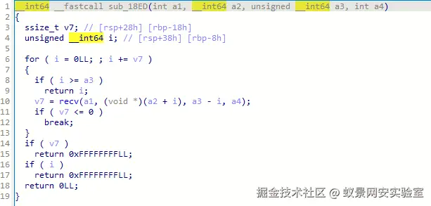 接着必须有数据输入,程序用 sub_18ED,底层调用 recv,从网络读指令