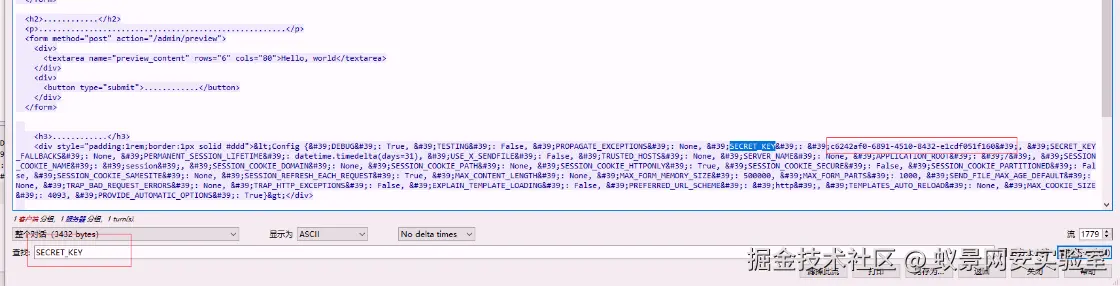 这段流量是 Flask 框架应用配置对象 的完整序列化输出,攻击者通过 SSTI(服务端模板注入) 漏洞成功读取了内存中的敏感变量