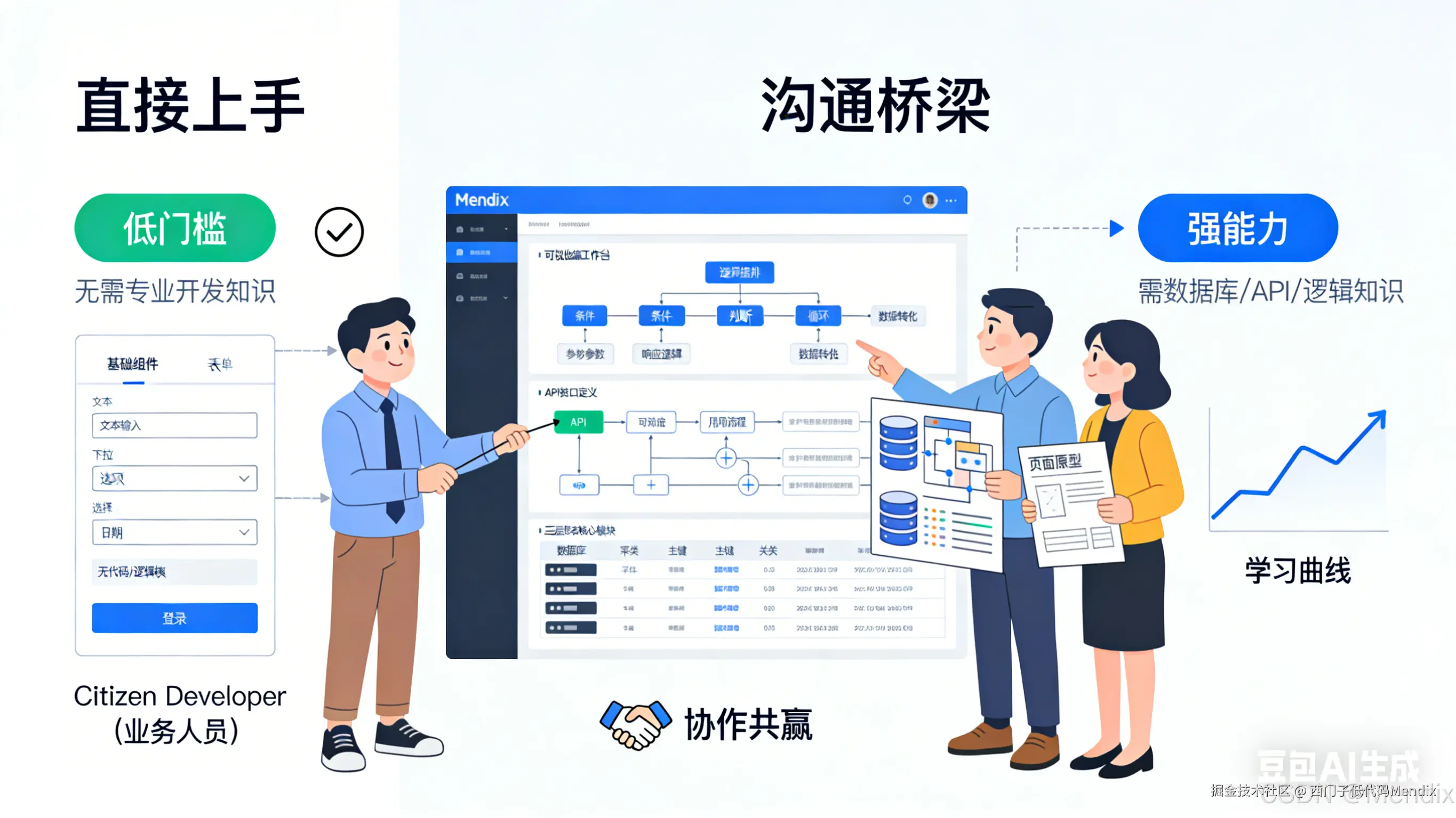 模型驱动: 虽然能力强,但学习曲线较长。它要求专业使用者具备数据库设计、API接口定义、逻辑编排等专业开发思维。它本质上是“可视化的编程”,而非“无脑的搭建”。业务人员可以学习后搭建简单应用,或者实现页面构建等部分简单功能,和专业开发者在同一平台协作,将平台作为沟通的桥梁。